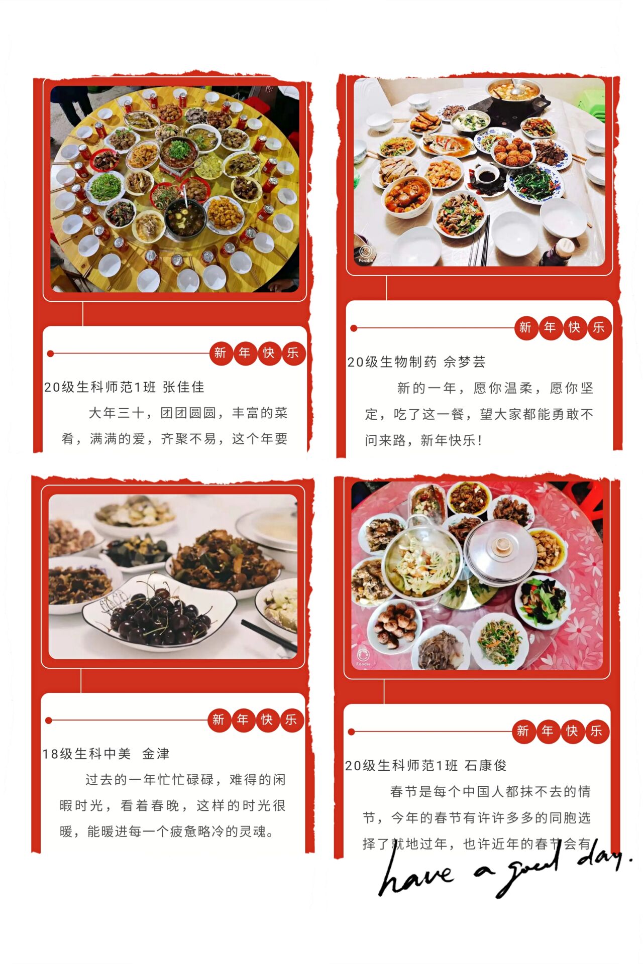 年年除夕夜,团圆年夜饭。同学们纷纷晒出和家人一起忙碌了一天精心准备的年夜团圆饭。不同的是佳肴与习俗,相同的是人们对于新年的美好期许,一家人其乐融融围坐在热气腾腾的菜肴面前,岁月静好也不过如此。