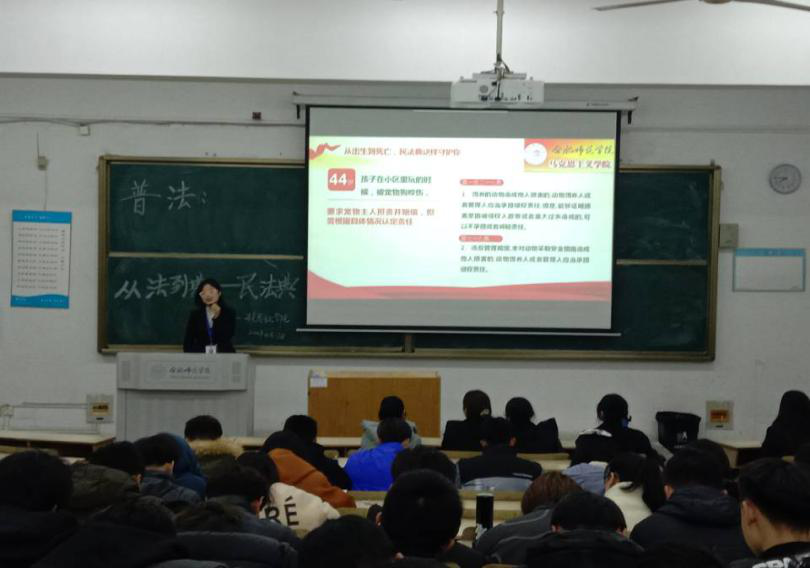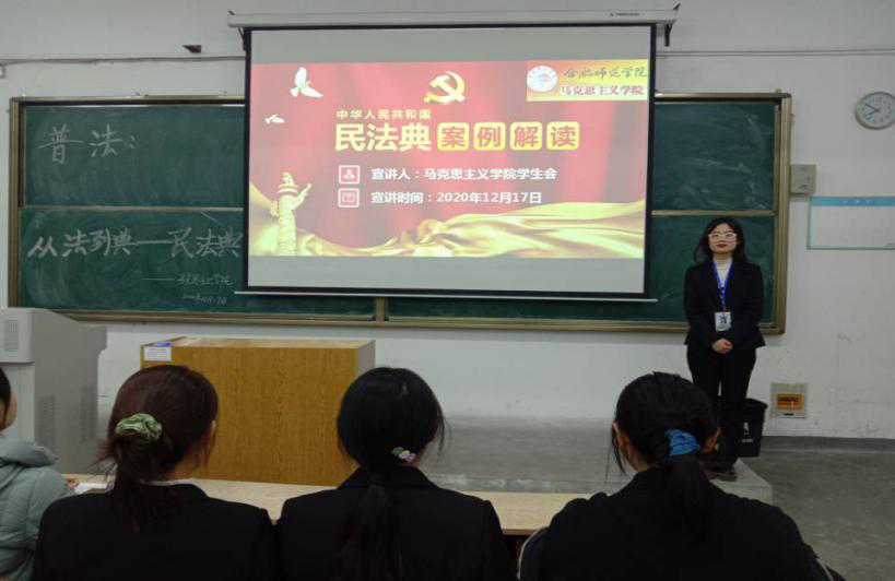 本网讯 为积极宣传中华人民共和国首部民法典,12月17日马克思主义学院学生会在beat365唯一官方网站锦绣校区博学楼111举办“普法:从法到典——民法典”宣讲活动。活动由马克思主义学生会主席罗心仪主持、学生会成员许林宣讲、本校部分同学参与。