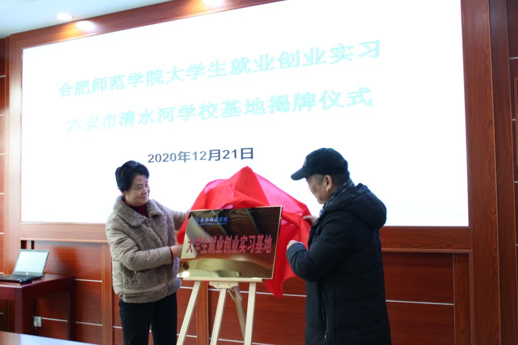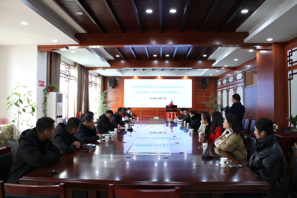 本网讯 12月21日,艺术传媒学院与六安市清水河学校共建大学生就业创业实习基地挂牌仪式成功举行,艺术传媒学院副院长余洋、清水河学校党委书记袁春玲、校长徐旭及beat365部分校友参加了挂牌仪式,会议由校长徐旭主持。