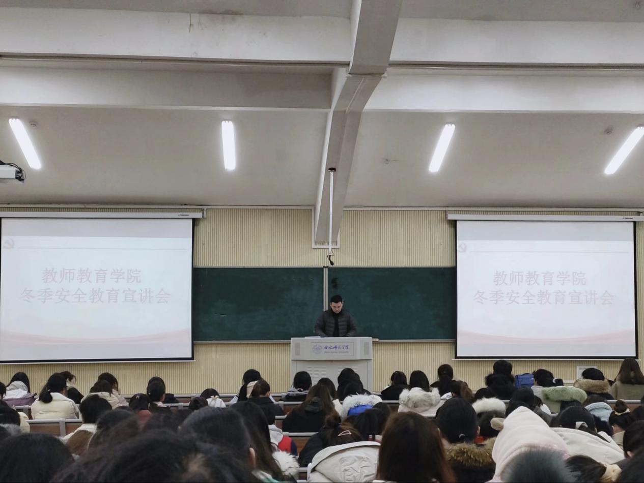 本网讯 为进一步落实疫情常态化防控、做好学生的冬季安全教育,提高学生安全防范意识和自我保护能力,按照教师教育学院党委统一部署,12月教师教育学院陆续在三孝口、锦绣和滨湖校区开展了冬季安全教育工作。12日14日,滨湖校区学生冬季安全教育会在刘铭传教学楼A101教室如期举办,该院滨湖校区2019级和2020级全体学生参会,教师教育学院辅导员王磊、唐淼老师参加并主持了会议。