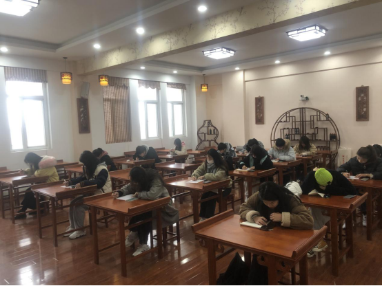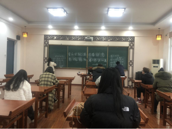 这是继上午弹唱类比赛后的第二项比赛。比赛面向2017级音乐学专业和2019级音乐学专业,采用现场比赛,共分两个环节进行:其中2017级进行粉笔字比赛,2019级进行钢笔字比赛,参赛内容均为带音乐诗句的唐诗或宋词。音乐学院辅导员王岩与青年教师潘怡担任此次比赛的评委。