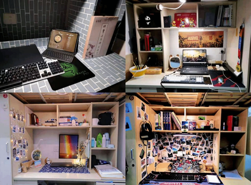 女生寝室的同学们精心布置属于自己的小角落,充满浓厚的艺术风格,同学们的桌面整洁干净,无不彰显出她们对美的向往。其中,3栋B216和3栋B122两个寝室利用干花、复古妆镜以及一些精致的小摆件进行美观的摆放,整体看起来更加的复古精致,使人具有更美的观感。3栋B120寝室 桌面以深色为主色调,彰显复古风格,充满艺术格调。利用贴纸、小物件来装饰自己的桌子,每一个角落都流露出寝室成员对生活的热爱。