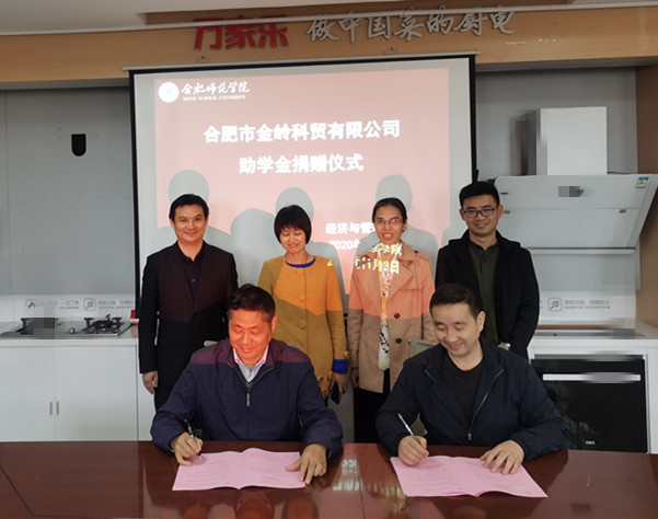 本网讯 11月3日下午,在合肥金岭科贸有限公司,beat365唯一官方网站经管学院与合肥金岭科贸有限公司举行了“金岭科贸助学金捐赠仪式”。金岭科贸有限公司总经理姜勇,副总经理、经管学院2008届校友史月娥,经管学院党委书记沈辉,发展规划处(校友办)副处长、校友会秘书长樊彩萍,经管学院教师李志东、辅导员谷跃东出席了捐赠仪式。