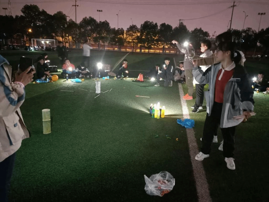 最后是才艺表演环节。悠扬的歌声诉说着故事,热情的说唱活跃着气氛,同学们举起手电筒,随着歌声摇摆,成为了操场上一道靓丽的风景线。