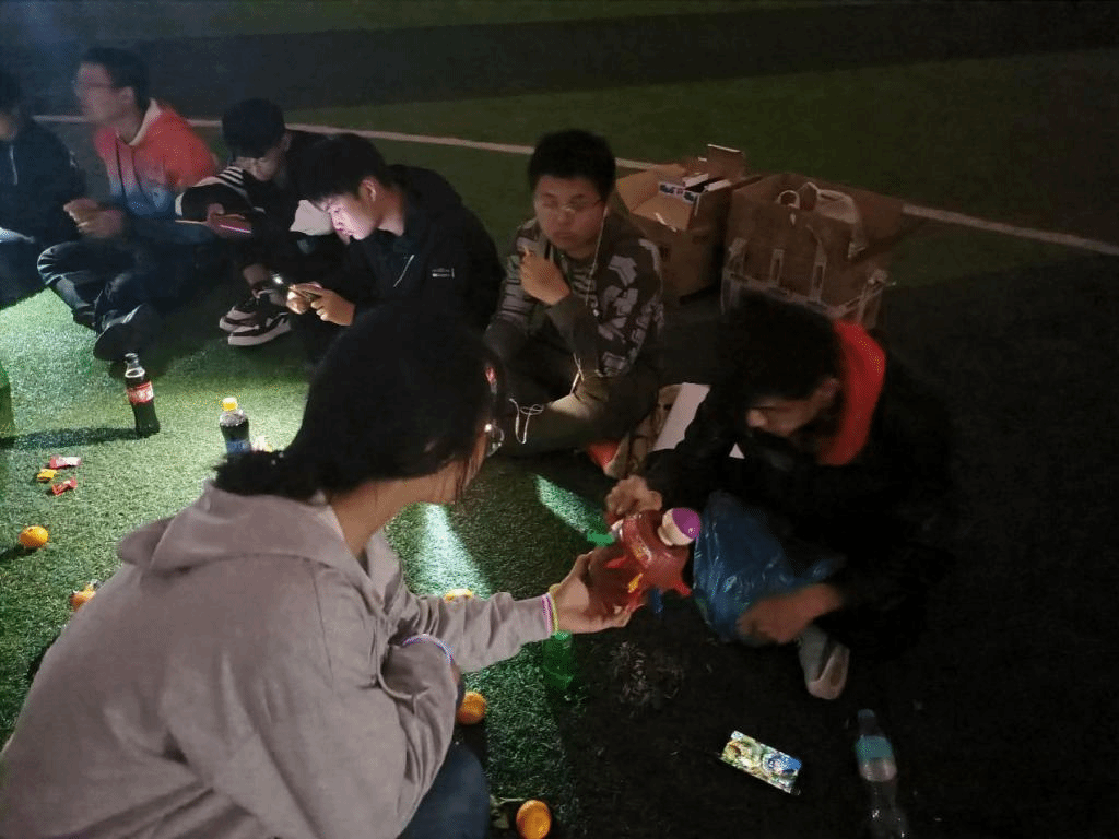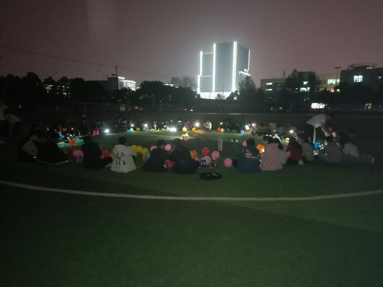10月31日晚7点全班同学在操场集合,在主持人的引导下,全班同学围成同心圆,席地而坐,相关负责人分发道具、零食等。