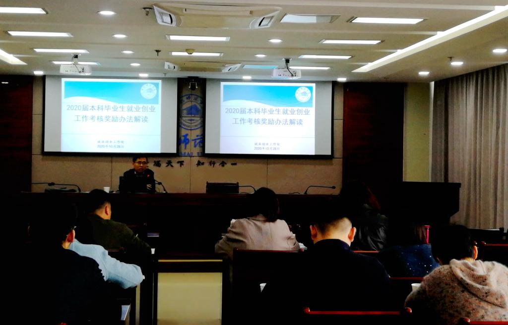 本网讯 为做好本科毕业生就业创业工作考核奖励办法实施工作,10月28日上午,就业创业工作处在锦绣校区行知楼面向各二级学院2020届本科毕业生就业创业工作人员开展就业创业工作考核奖励办法培训,就业创业工作处相关工作人员进行了解读和说明。