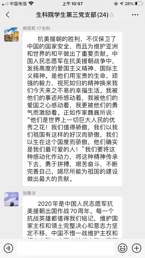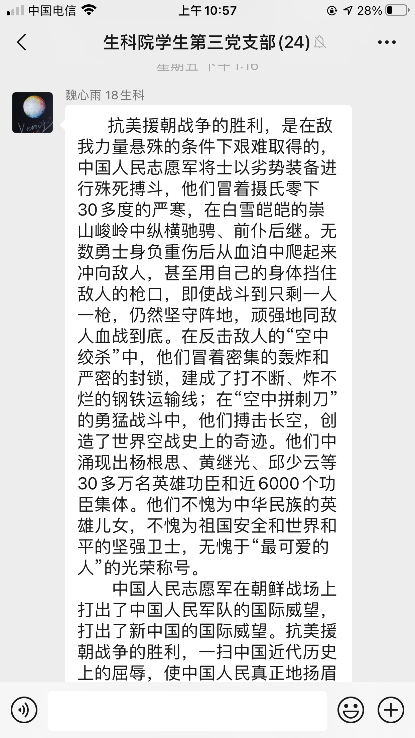 其他党员同学也都纷纷表示,一定要铭记抗美援朝战争的艰辛历程和伟大胜利,继承好、弘扬好伟大抗美援朝精神,不断砥砺民族风骨、汇聚民族力量、锻造民族血性、激发民族智慧,立足岗位,扎实工作和学习,为实现中华民族伟大复兴而努力奋斗。(生命科学学院:李万成)
