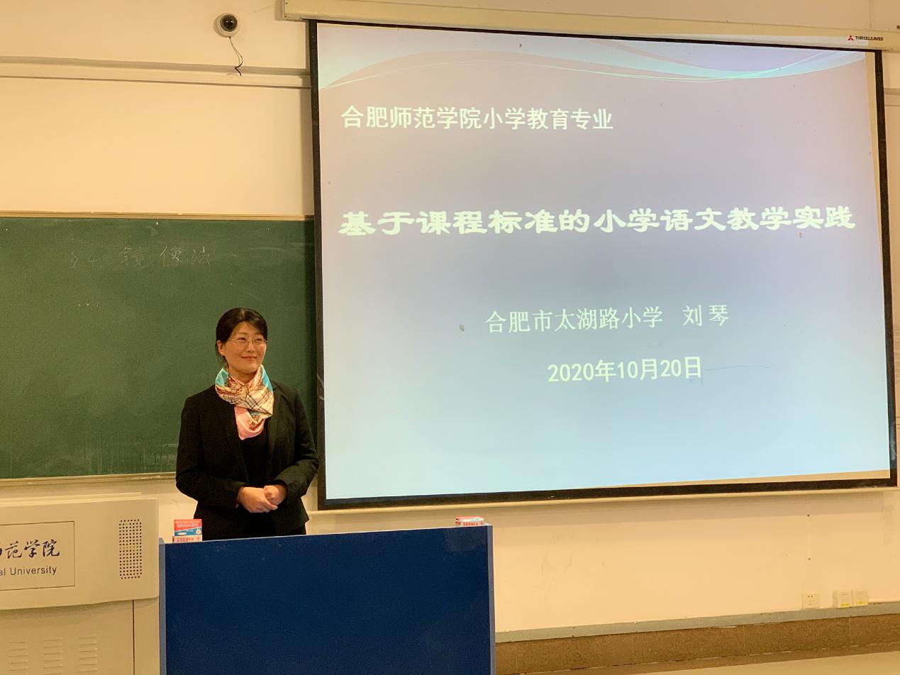 合肥市学科带头人,安徽省教坛新星太湖路小学语文高级教师刘琴开展了题为“基于课程标准的小学语文教学实践”的讲座。刘琴老师从“研读课程标准”、“用好语文教材”、“培养学生对母语的喜爱之情”等方面对当前教育部语文统编教材的教学教法进行了详细解读。她结合自己一线教学中的丰富案例,讲解课程标准对语文教师的重要性,强调语文人文性和工具性相统一的课程性质,并让在座的同学们结合所学的相关理论进行思考,使同学们对语文教学实践有了更进一步的认识。她还结合当前同学们进行的实习给出了建议:多记录,多阅读,多反思。
