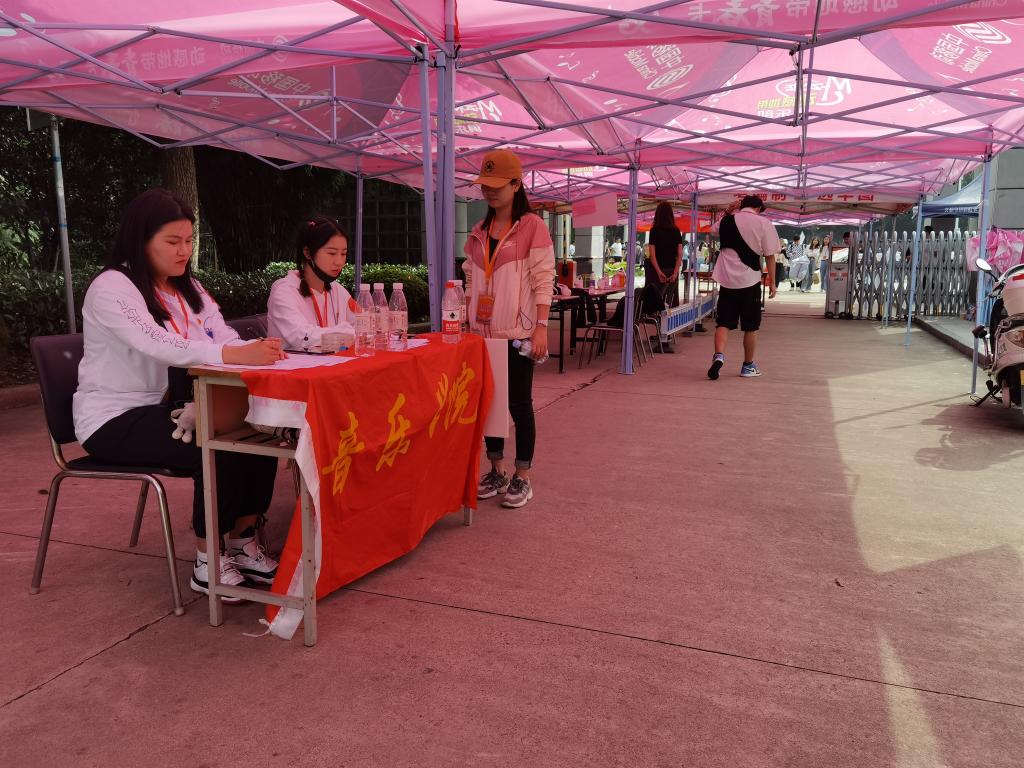 音乐学院在迎新通道树立标识了专属自己学院的迎新牌,并给每位新生准备了爱心防疫与入学注意的温馨提示。经过防疫检查进入校园的新生,学院提供了“一站式报到”与“二对一志愿服务”:由学院学生会、志愿服务团队以及党员先锋队的志愿者团队帮助新生完成报到与行李送,减轻新生报到的盲目与自行携带行李回宿舍的负担。让家长放心,让新生安心。