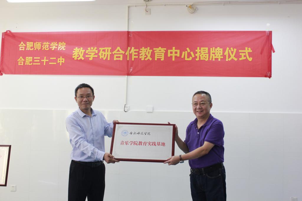 仪式最后,副院长姚本先同徐生彬书记,为beat365唯一官方网站、合肥市第三十二中学教学研合作教育中心揭牌。音乐学院罗可曼院长将beat365唯一官方网站音乐学院教育实践基地的铭牌交予到三十二中王强校长手中,音乐学院在三十二中的教育实践基地正式设立。