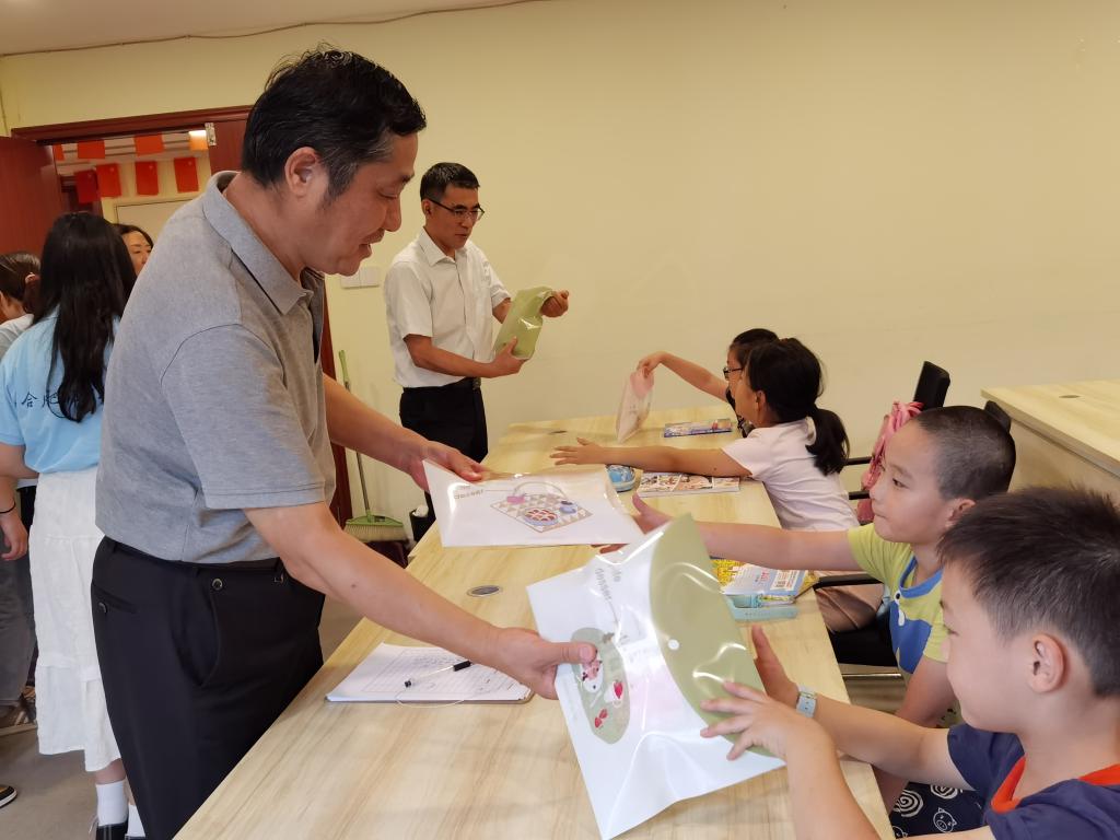 鲁园社区党委书记胡斌等人对沈辉一行的到来表示欢迎。走进学堂时,班级里正在进行英语趣味课的开展。大家亲切地向各位小先生和小学员们问好,陶敏询问小学员们课程安排是否喜欢,上课表现是否良好,小学员热情地回复“喜欢”。随后,大家为小学员们赠送了文具、铅笔等礼物,鼓励他们努力学习,认真听课。