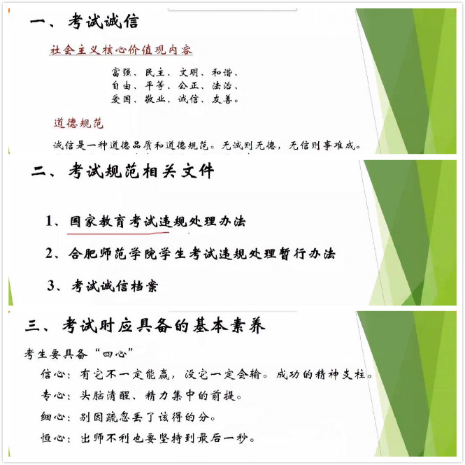 三是开展线上诚信主题班会。2019级各班围绕诚信期末备考展开主题班会,着眼于临近的期末考试,分析了同学们本学期线上学习中存在的问题,督促大家抓紧时间备考,强调诚信考试的重要内涵及意义。同时,指出诚信是做人之本,诚信的行为铸就诚信的人格,是大学生必不可少的素质,线上考试更考验大家的自觉性和诚信度。