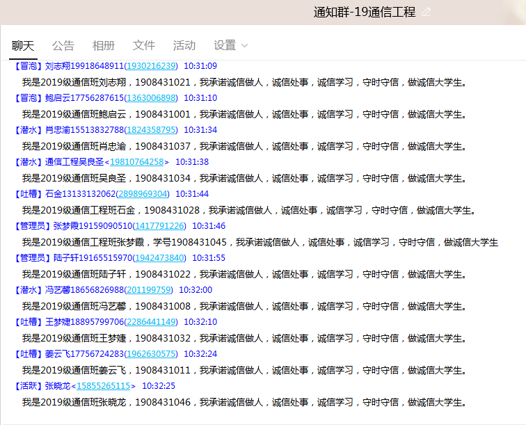 同时,学院积极组织非毕业班级通过QQ群组方式发出诚信承诺,学生们纷纷表示诚信做人,诚信处事,诚信学习,守时守信,做一名诚实的大学生。