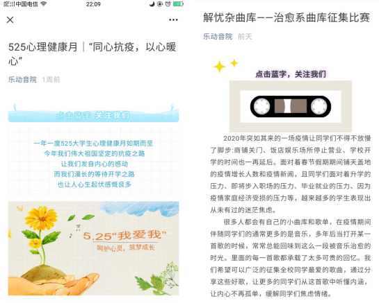 在疫情期间伴随同学们的通常更多的是音乐,当打开某一首歌的时候,常常能回味到一段被音乐治愈的时光,歌曲承载了太多可贵的回忆。正值学校“525心理健康月”,音乐学院推出了“解忧杂曲库”线上征集活动,通过广泛征集全校同学最爱的歌曲,分享自己最喜欢最感动并且能温暖心灵的歌曲,说出并写下自己的心情故事,让更多的同学们从这首歌中听懂内涵,让内心不再孤单,缓解同学们焦虑情绪。