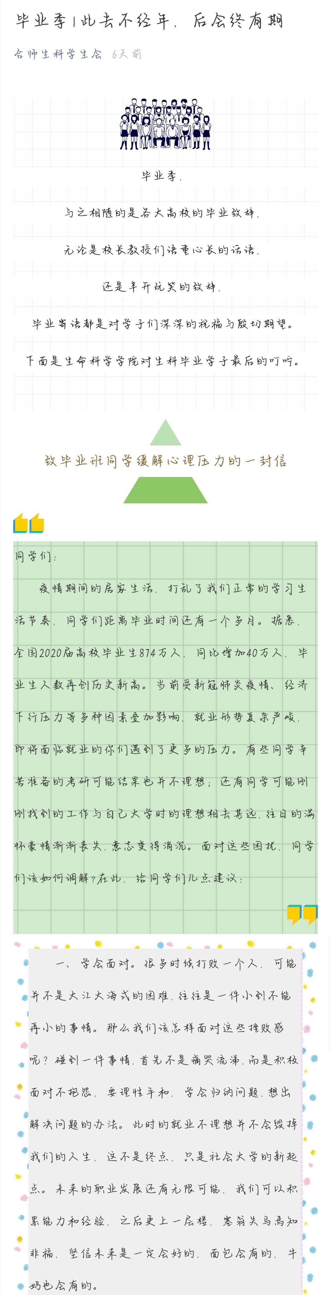 时至各大高校研究生复试时间,不少同学在准备复试的过程中倍感压力,同时还有部分同学由于今年疫情的原因,在求职中遇到了一些困难,针对以上同学可能出现的心理困扰,生命科学学院党委着手起草了《致毕业班同学缓解心理压力的一封信》,针对目前毕业班学生可能会面临的一些困扰,一一给出了心理调试的建议,通过发送到班级QQ群和学院微信公众号推送给每一位毕业生。