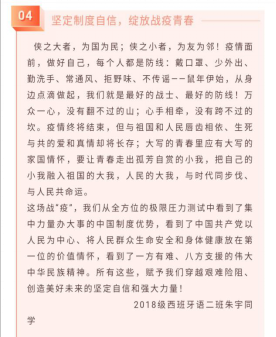 其中,朱宇同学写道“这场战疫中,我们从全方位的极限压力测试中看到了集中力量办大事的中国制度优势,看到了中国共产党以人民为中心、将人民群众生命安全和身体健康放在第一位的价值情怀。”字里行间流露出对中国共产党的爱戴,对国家制度的认同。