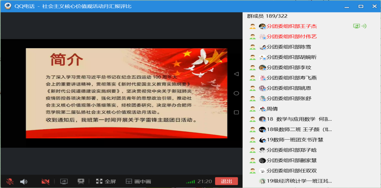 本网讯 为总结社会主义核心价值观活动月暨雷锋月活动的优秀成果,选树弘扬社会主义核心价值观和青春战疫的先进典型,4月7日晚,数学与统计学院开展了第二届社会主义核心价值观活动月暨雷锋月线上汇报评比活动,数学与统计学院党委书记郑支农、党委副书记穆娟,分团委负责人、各年级辅导员及各团支部代表300余人参与了此次线上评比活动。