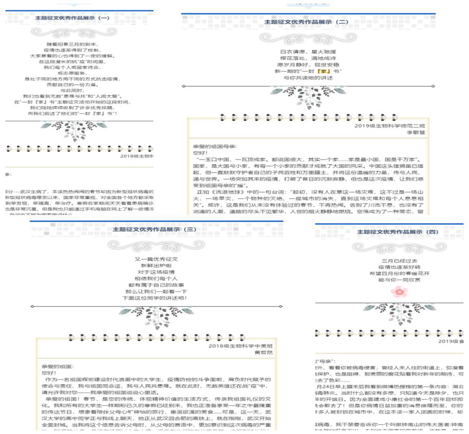 本网讯 为进一步弘扬社会主义核心价值观,加强爱国主义教育,生命科学学院开展了“一封家书”主题征文活动,疫情期间,给祖国母亲写一份深情的“家”书,让它承载着青年大学生对国家抗击疫情举措的关心与关注,让青年大学生的家国情怀在字里行间沉淀流传。
