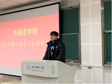 本网讯 为了增强我院学子新时代共青团员的责任意识,鼓励新生团员勇担国家时代发展需求的使命,外国语学院于12月5日在滨湖校区和锦绣校区同时举行2019级新生团员三证颁发仪式。