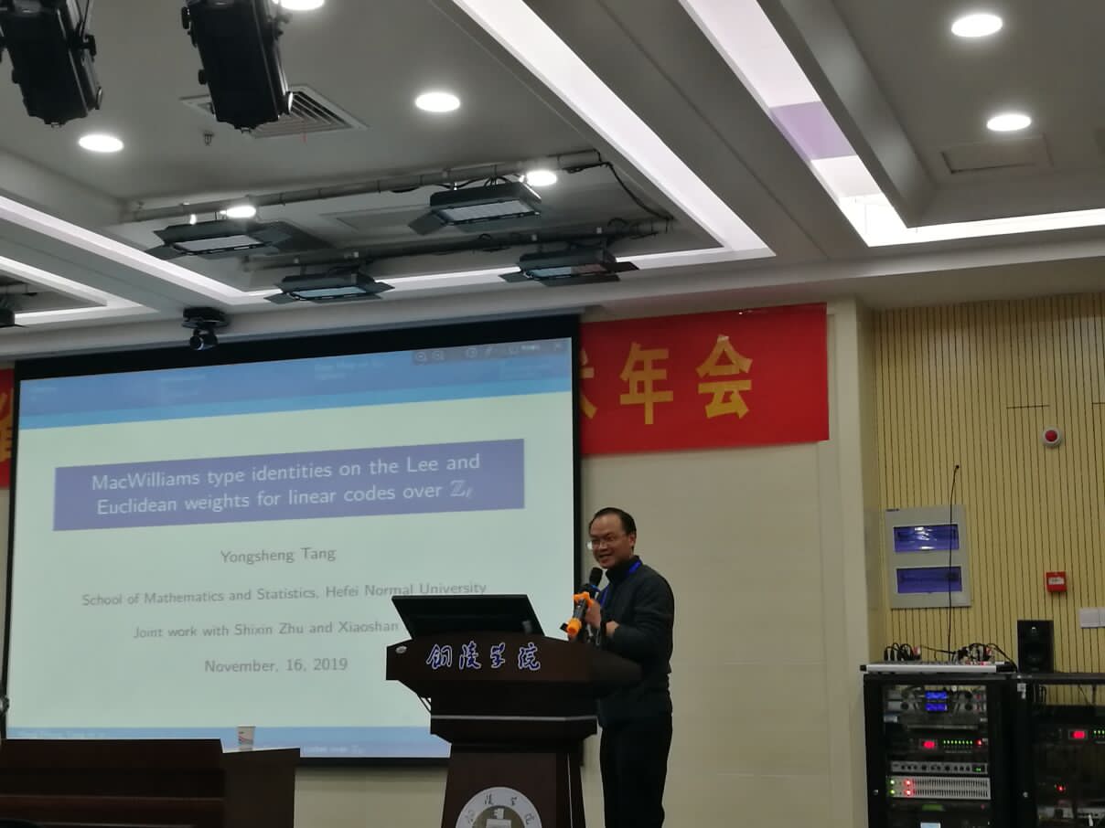 16日下午,小组会议分成高校教学类专题、高校科研类专题和中学组专题分别进行报告交流。beat365唐永生博士在高校组科研类专题组作了题为“MacWilliams type identities on the Lee and Euclidean weights for linear codes over Zl”的学术交流分组报告,并与同行作了广泛交流。中学组在铜陵市第一中学进行了分组报告与研讨。beat365张新全老师全程参与交流。