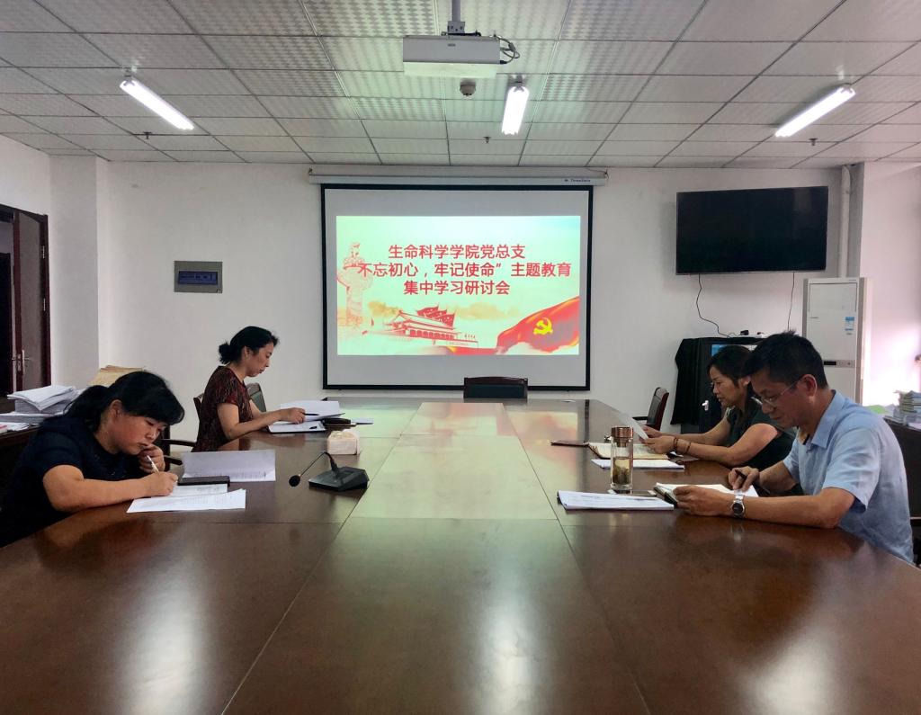 25日下午,生命科学学院在行知楼1502开展处级党员领导干部集中学习研讨会。党总支书记郭桃芬、生命科学学院院长徐忠东、副院长朱桂兰、组织员孙淑兰参加会议。会议先学习了习近平总书记在“不忘初心、牢记使命”主题教育工作会议上的重要讲话、《习近平关于“不忘初心、牢记使命”重要论述选编》中“人民对美好生活的向往就是我们的奋斗目标”、“认真学习党章,严格遵守党章”等内容。随后,围绕“共产党人的初心使命”这一专题内容,处级党员领导干部展开集中研讨,并交流发言。