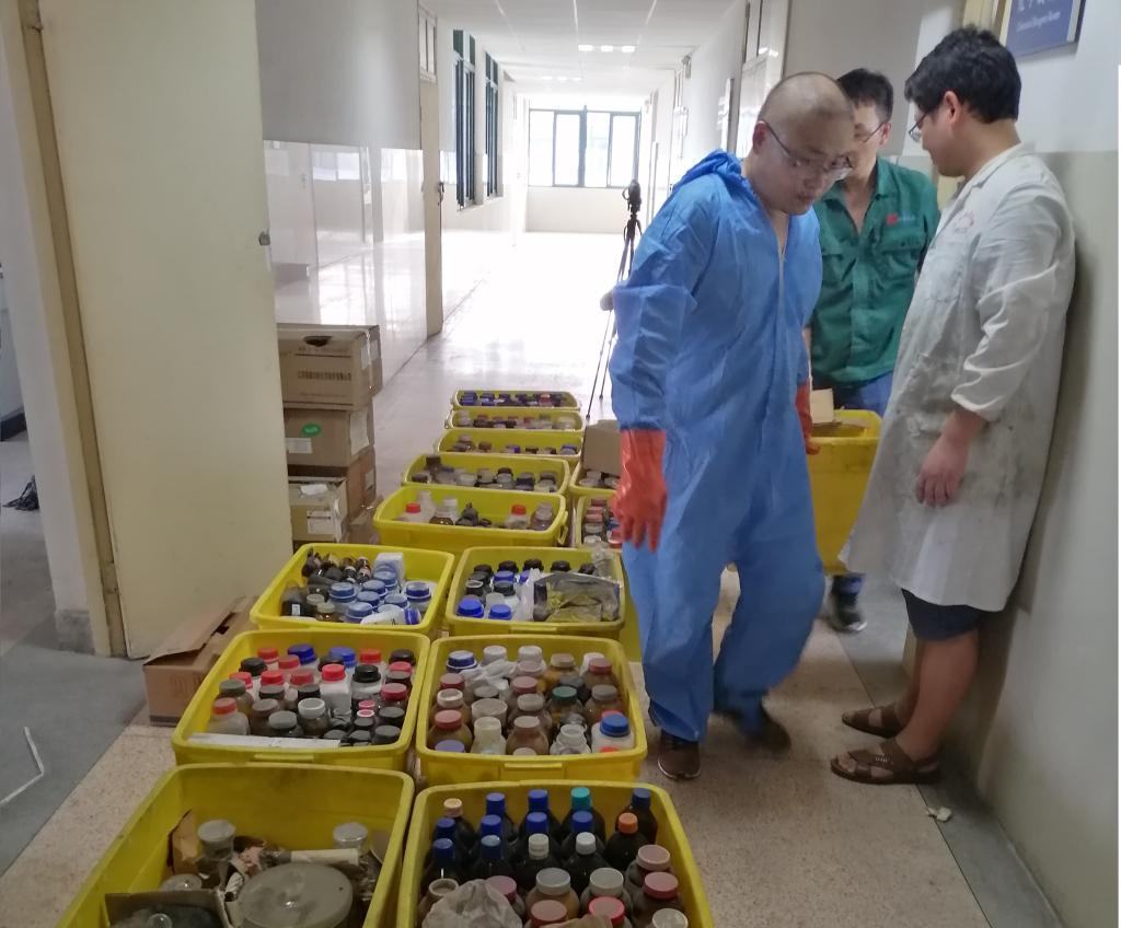 本网讯 9月12日,在教务处的统一安排下,化学与化学工程学院实验室存放多年的废弃化学试剂全部妥善处理。