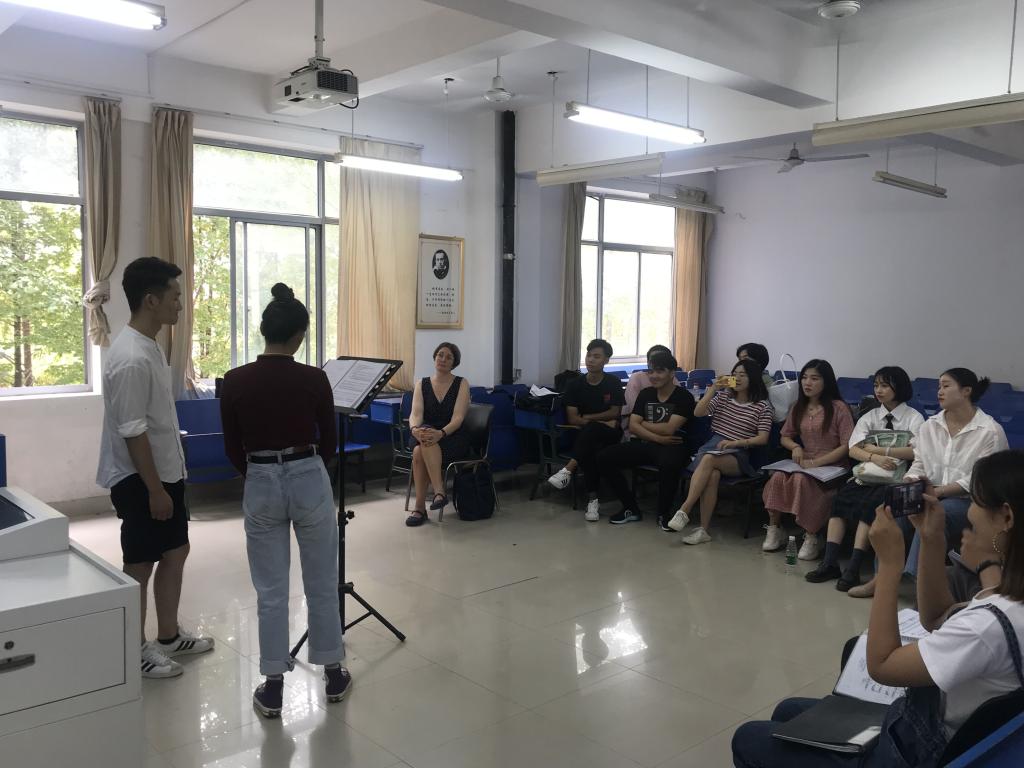 教学伊始,Eva教授采用轻松愉悦的小游戏让学生们放松身心,做为课前准备。接着十余名同学依次上台演唱事先准备好的作品,教授细心指导,并进行示范,在重唱作品的演唱中,教授更是强调了演唱者合作、交流的重要性,学生们受益匪浅。一天的教学交流结束,Eva教授在教学中耐心的指出了学生的不足,同时也肯定了我院学生的专业技能。她生动活泼的音乐课堂,让我院师生体会到音乐教学的乐趣,并很快的适应了“新课堂”。