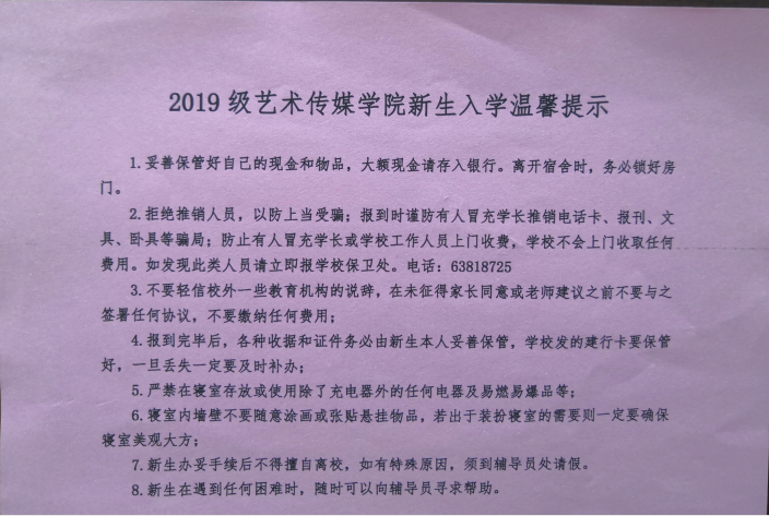 本网讯 为引导和帮助新生全面适应新起点新校园新生活,树立和提高安全防范意识,掌握和用好必要的安全知识,增强同学们的自我保护和防范能力,9月6日—7日,艺术传媒学院开展2019级新生入学安全教育“三部曲”活动。