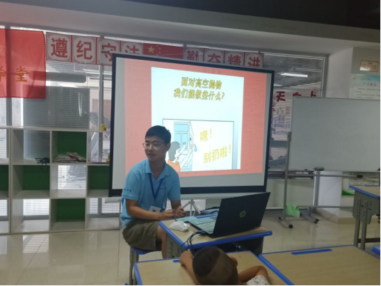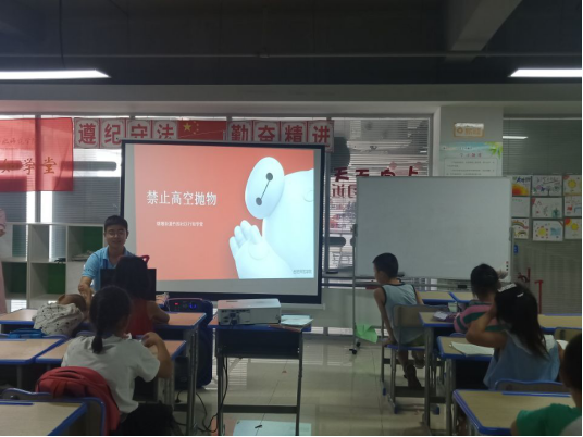 “小先生”邹江鹏从四个方面开展宣讲,介绍了什么是高空抛物;日常生活中要特别注意的高空危险物品,包括菜刀、啤酒瓶和花盆等;同时指出了高空抛物会带来的极大危害,轻则使人受伤,重则危及性命;并在最后教育小学员们不仅要在日常活动中防范高空抛物,更要以身作则,抵制高空抛物的不良行为。邹江鹏“小先生”深入浅出的讲解知识,将漫画元素融入讲座内容中,把这些对于小学员们来说有些难懂的专业知识变得浅显易懂,小学员们听得格外认真,不时举手发表自己的看法或提出疑惑,课堂气氛十分活跃。
