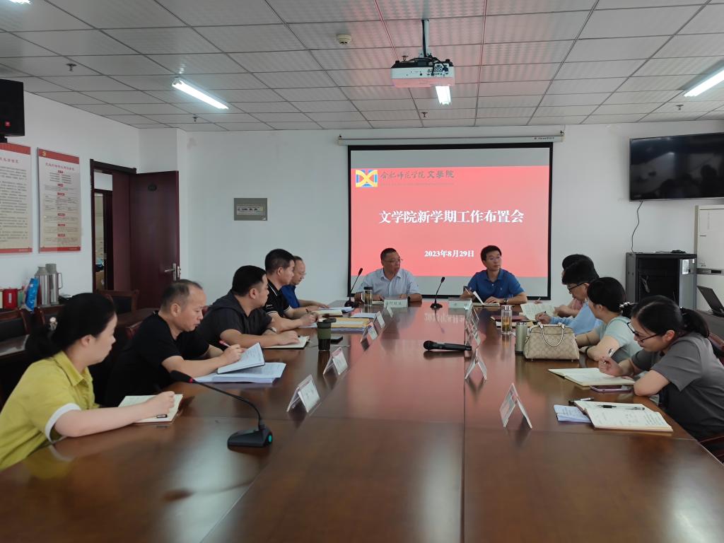 本网讯 8月29日下午,文学院召开2023年秋季学期开学工作布置会,传达学校相关会议精神,部署新学期及下半年主要工作。文学院领导班子、系(部)主任、党支部书记、秘书参加会议。
