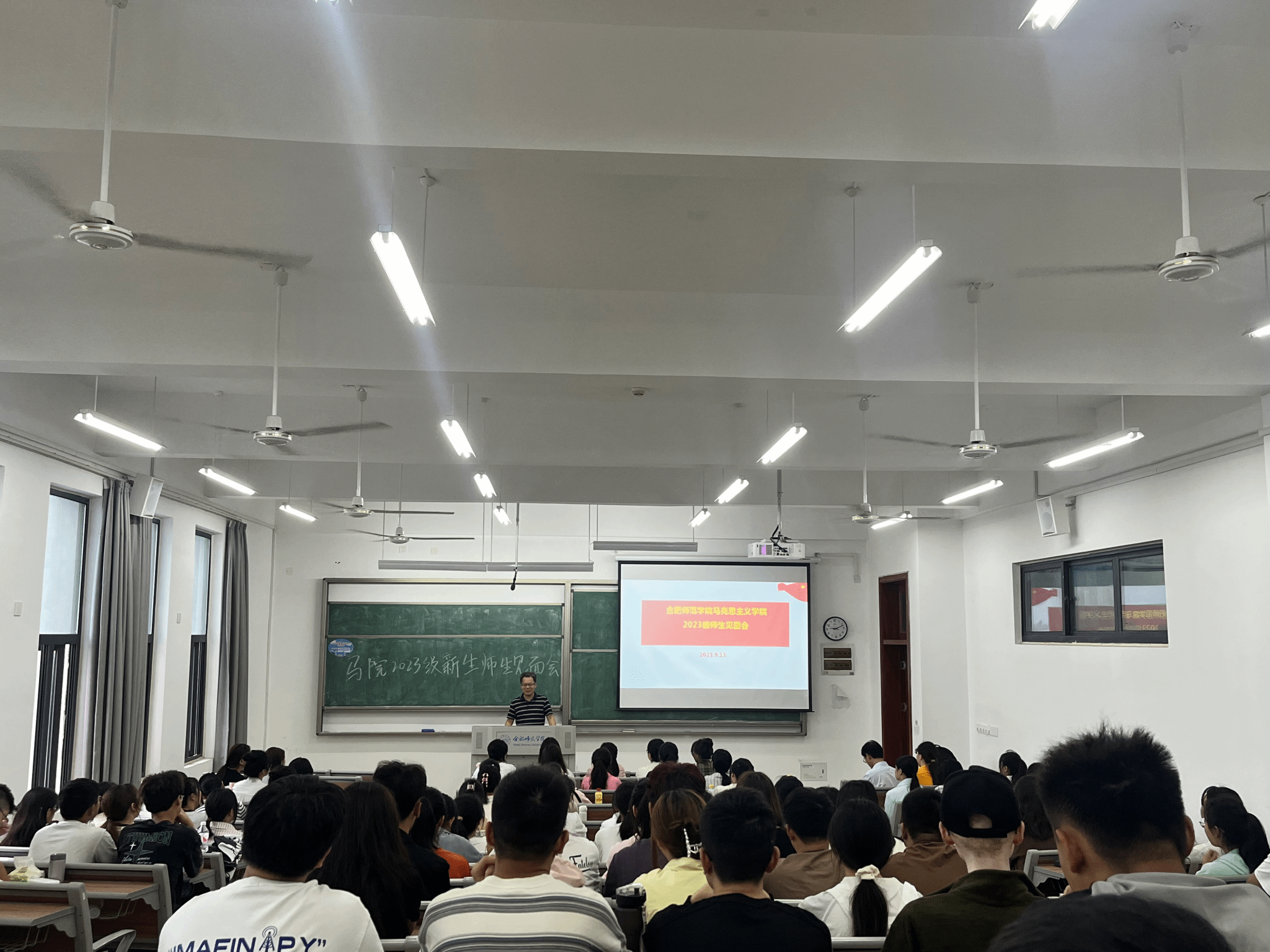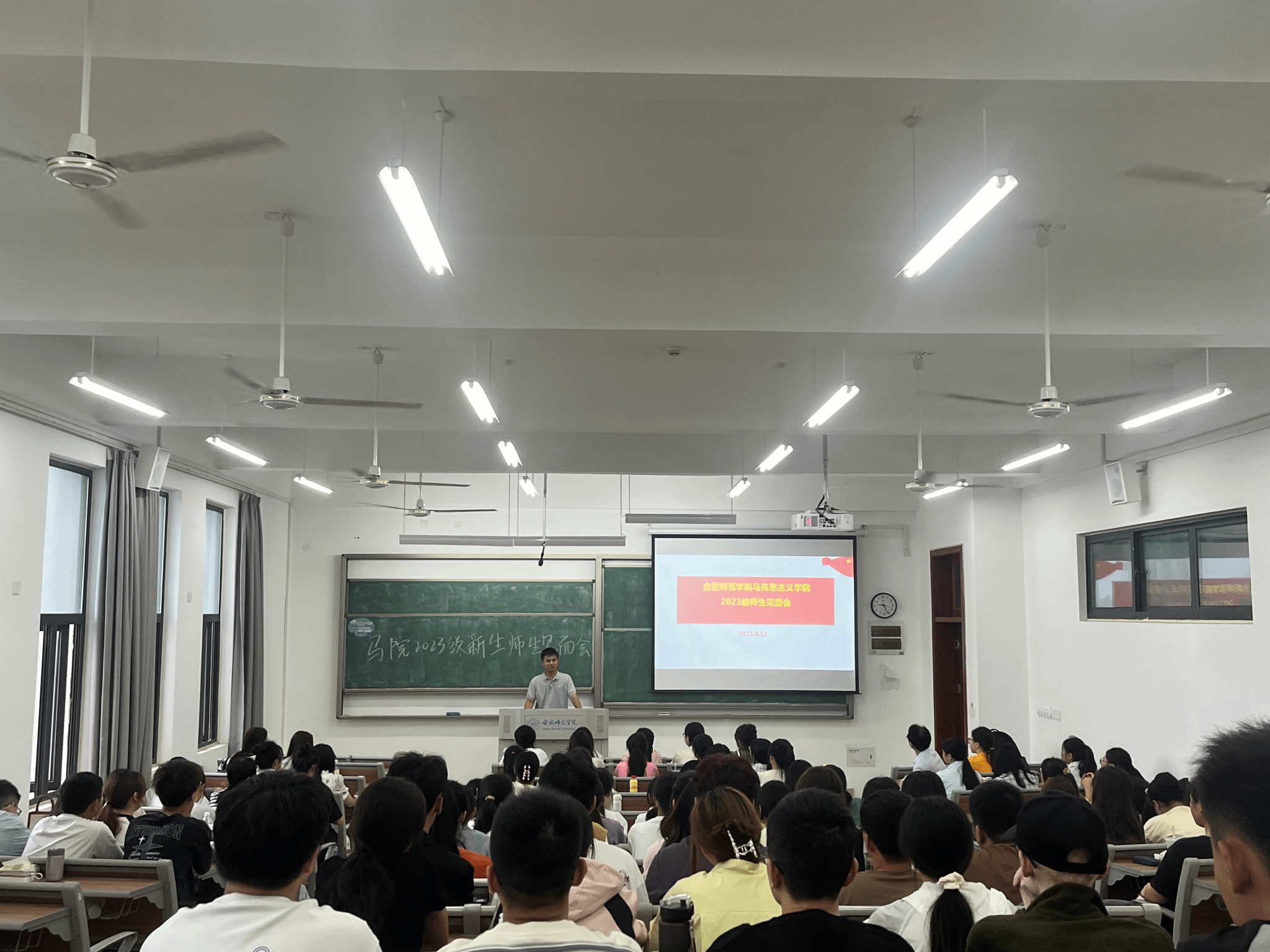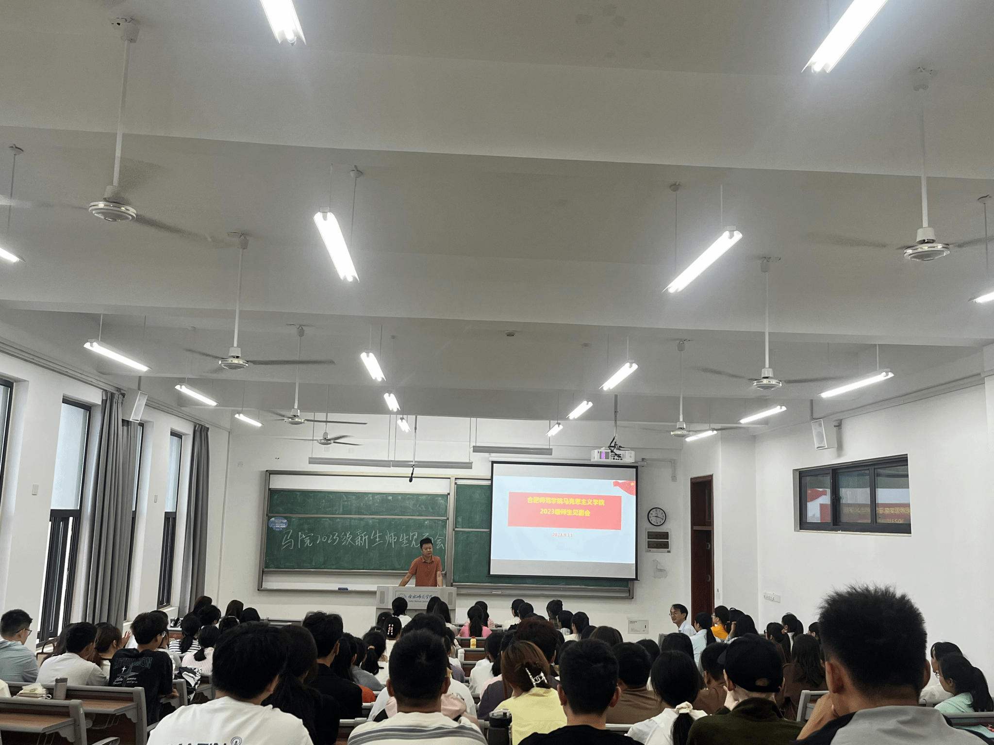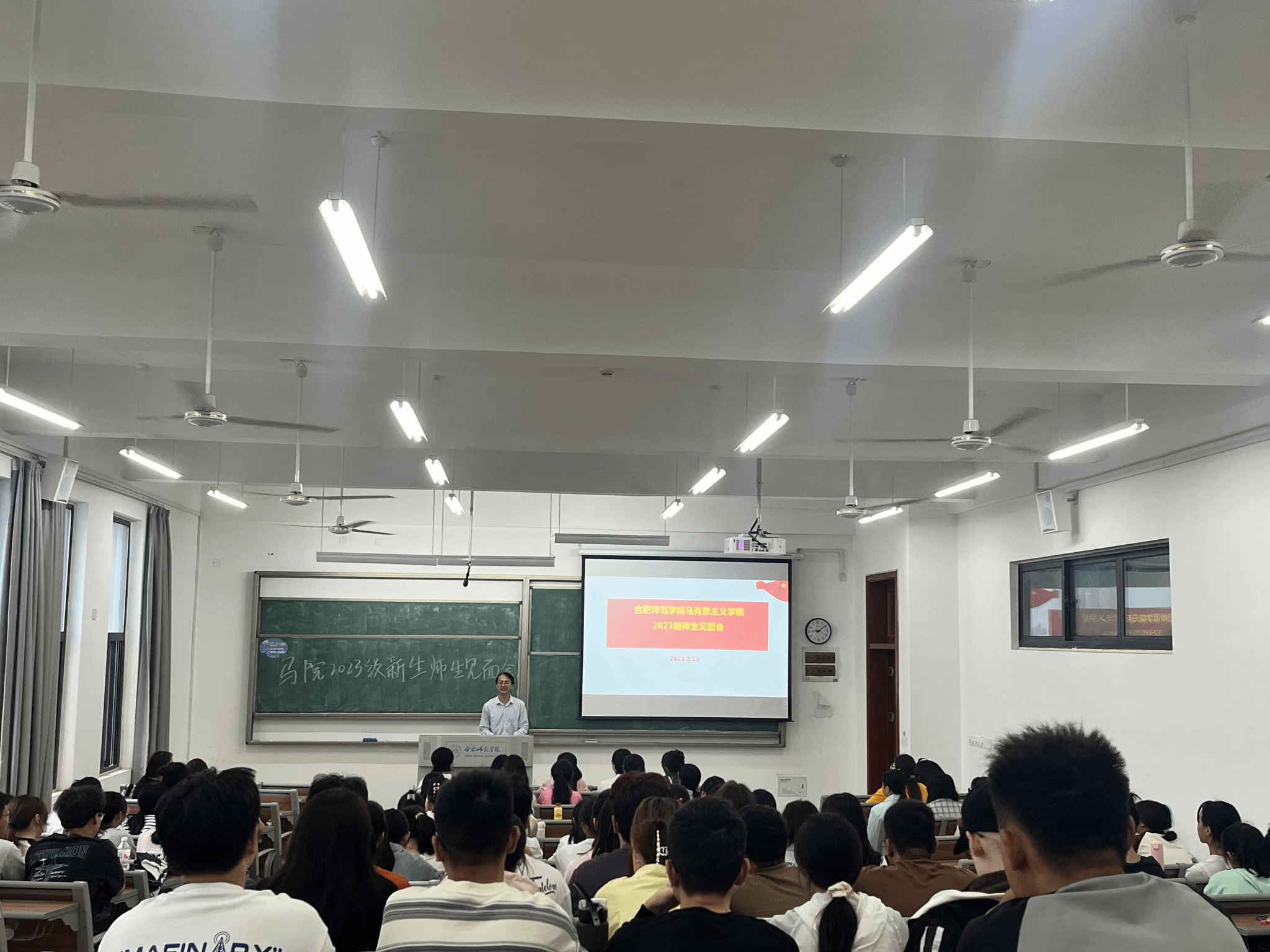 本网讯 新学期伊始,为进一步加强2023级新生对学院的认同感,尽快熟悉学院人才培养理念,适应大学的学习与生活,同时也增进新生与学院老师之间的师生感情,9月13日上午,马克思主义学院2023级新生师生见面会在滨湖校区铭传楼B304教室举办。会议由学院副院长方政主持,研究生教学部主任朱玉利、副教授王欣、副教授陈保同、新生辅导员王萌、优秀校友2010级思政班包丽蒙娜、两名优秀学生代表2021级思想政治教育班刘会龙和赵璟丽以及2023级全体新生共同参加。