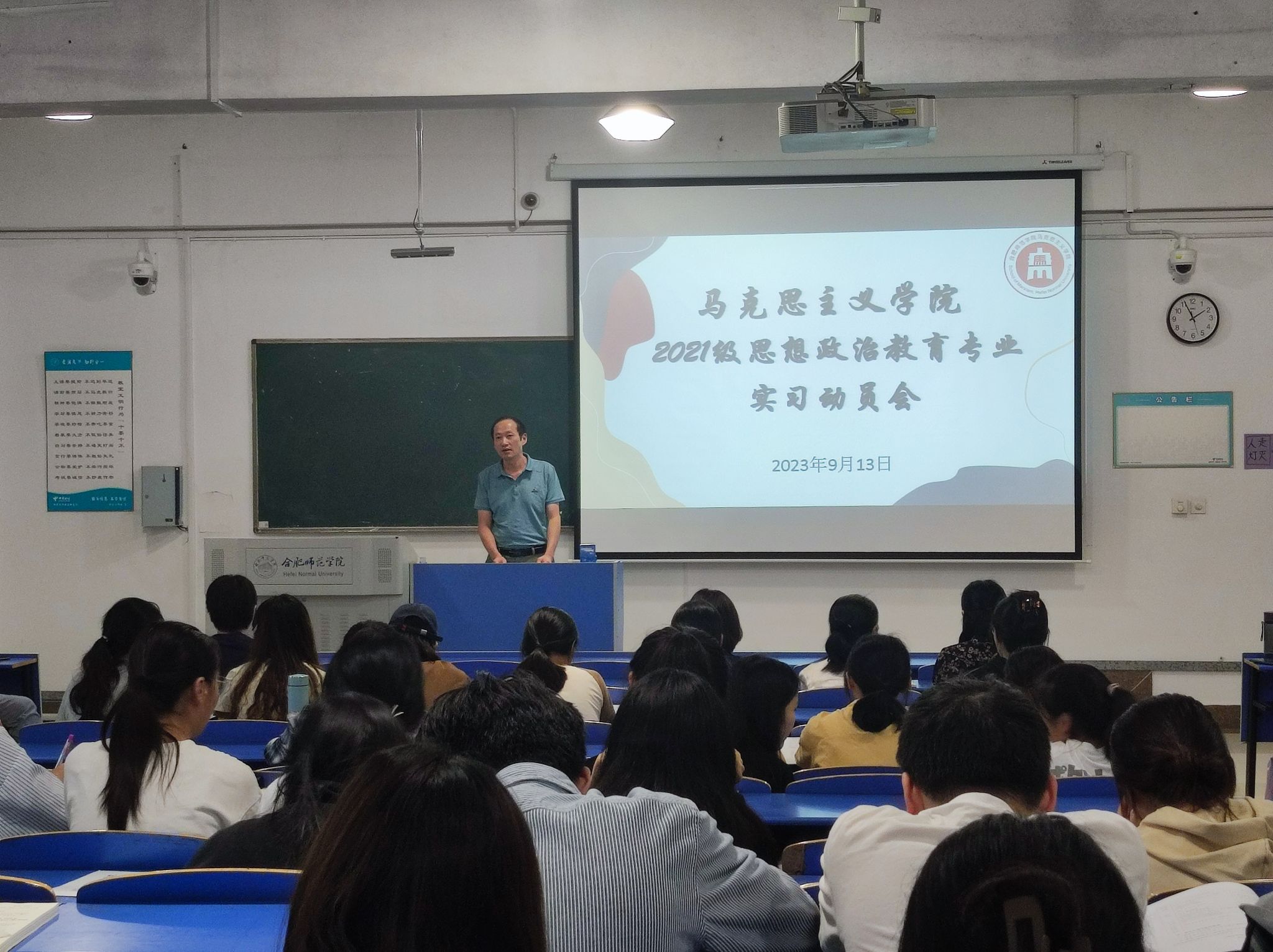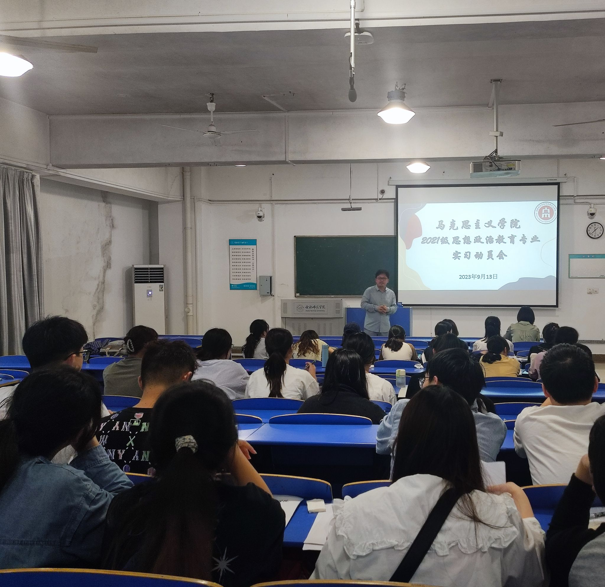 本网讯 为进一步做好教育实习工作,9月13日下午,马克思主义学院在逸夫楼A109召开2021级思想政治教育专业实习动员大会。马克思主义学院党总支书记刘艳、副院长方政、实践教学部主任魏兵、实习指导老师及2021级全体学生出席,会议由政法系主任周继祥主持。