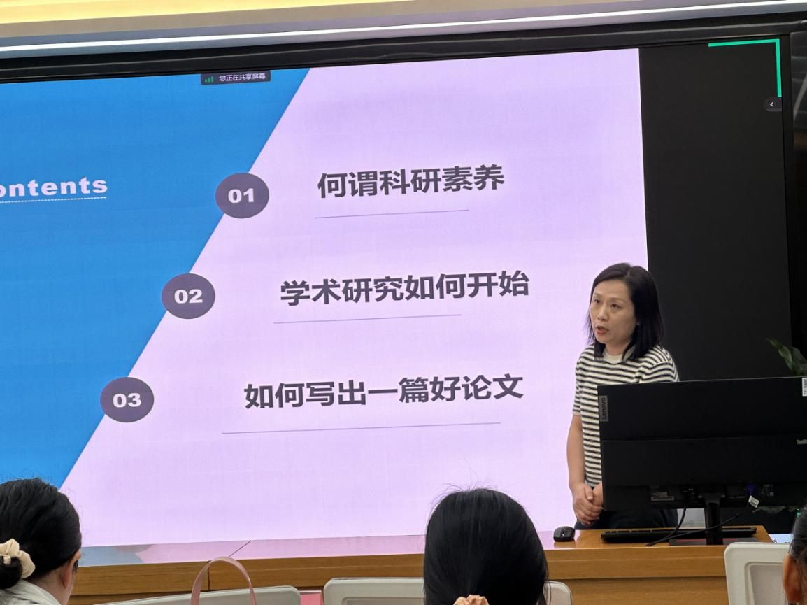 学院陈晓惠副教授为大家作《教育硕土科研素养培养与论文写作》报告,为研究生进一步提高科研素养、步入研究生学术生涯指明了方向。她强调研究生要有科研意识、要谨记科学规范、恪守学术道德,培养坚持、合作、创新的科研精神。同时就研究生如何开始一项专业的学术研究、如何写出一篇好论文进行了细致的讲解和示范。