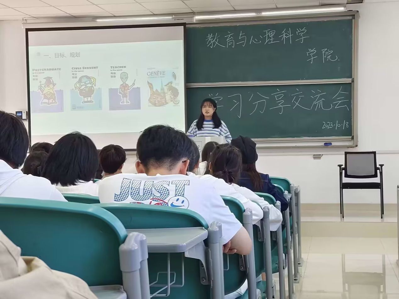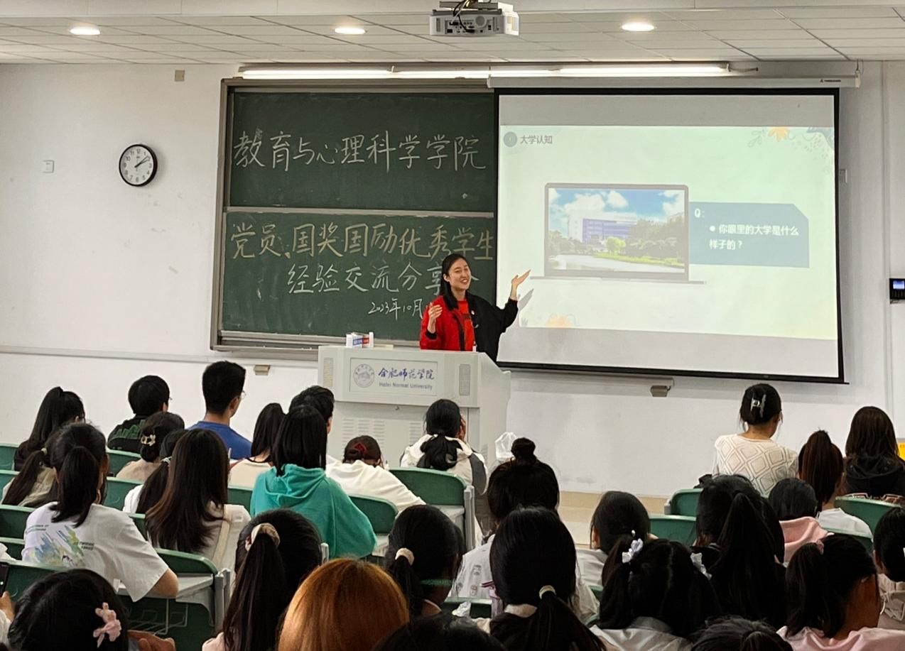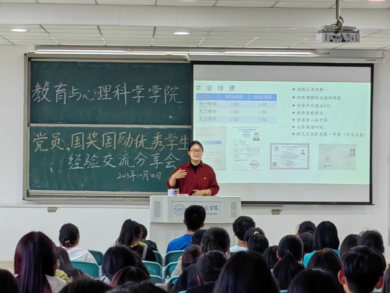 10月18日下午,教育与心理科学学院在滨湖校区博学楼C201、C203教室开展优秀学生党员经验分享交流会,三位优秀学生党员结合自己的成长经历向2023级全体普本新生说经验、话发展。