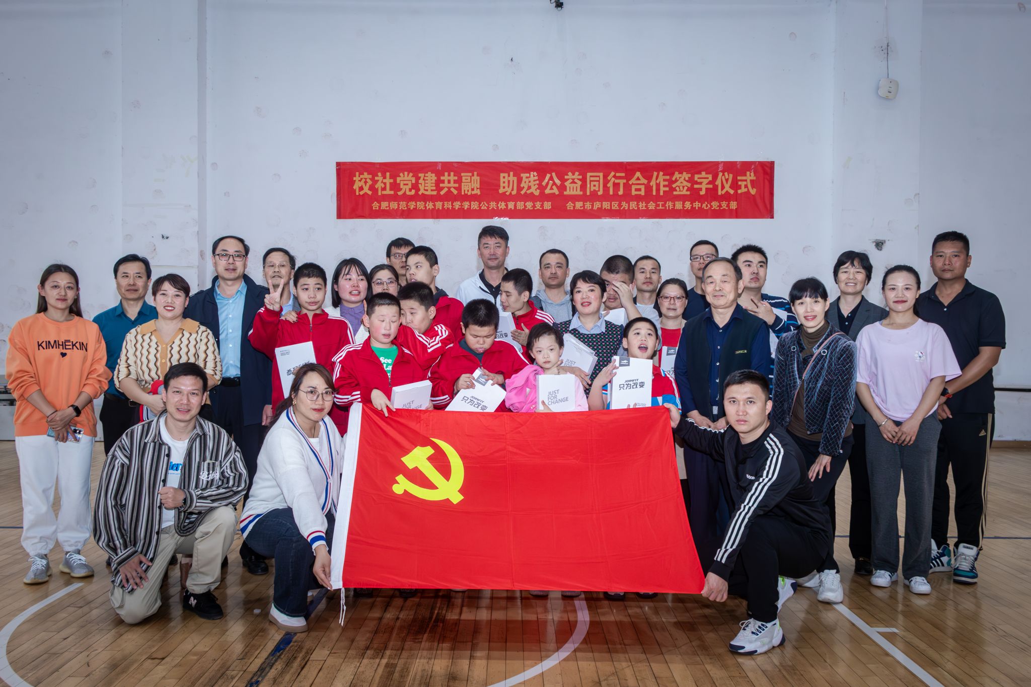 播下一粒种子,收获一片生机;献出一颗爱心,托起一份希望。10月25日下午,体育科学学院公共体育部党支部和合肥市庐阳区为民社会工作服务中心党支部“校社党建共融 助残公益同行”公益活动暨合作签约揭牌仪式在学校锦绣校区体育馆举行。体育科学学院党委书记赵波、党委副书记王飞、副院长席莉出席,合肥市庐阳区为民社会工作服务中心党支部书记李全志、中心老师和孩子们及部分家长代表,公共体育部党支部全体教师党员及各系部师生代表近百人参加。仪式由公共体育部党支部组织委员苏龙主持。