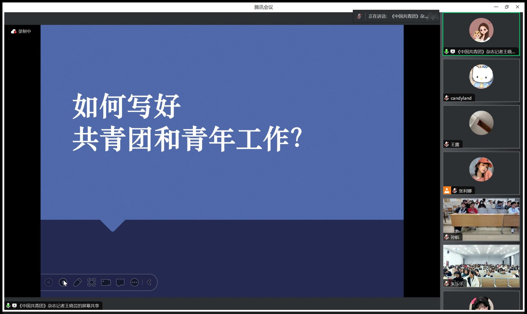 11月22日晚,《中国共青团》杂志社主任记者王晓芸通过腾讯会议作题为“如何写好共青团和青年工作”专题讲座。第五期校园媒体学生干部培训班全体学员参加活动。