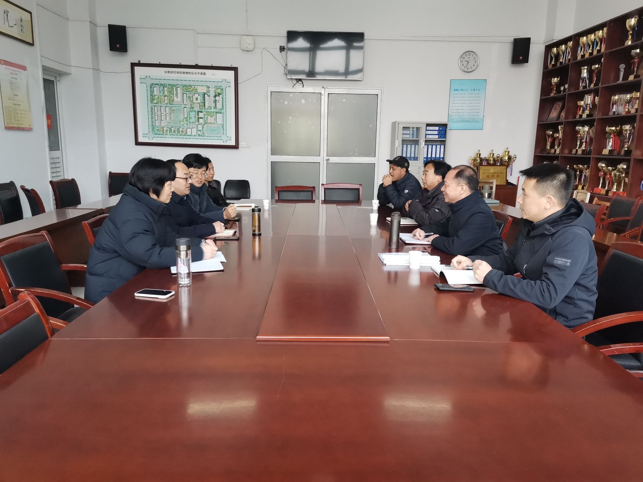 12月28日上午,宣城市生物工程学校校长王祥顺和宣城市体育运动学校校长肖亚平一行4人来到体育科学学院调研交流。发展规划处处长李大创,体育科学学院党委书记赵波、党委副书记王飞、副院长席莉参加交流会。