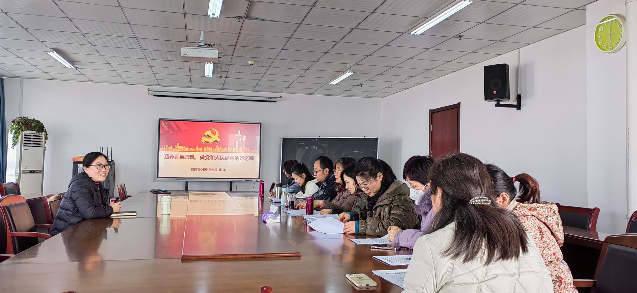 董萍从“深刻认识加强师德师风建设的重要性”“新时代教师要全面提升师德修养”“党员教师要做热爱学生、教书育人的模范”等三个方面对涵养师德师风,做党和人民满意的好老师进行了具体阐释。董萍指出,高校教师要把师德师风建设摆在首要位置、根植于教育家精神追求中,牢固树立为党育人、为国育才的理想信念,增强“四个意识”,坚定“四个自信”,自觉做到“两个维护”;要陶冶高尚的道德情操,涵养独到的育人智慧,勤修仁爱之心,胸怀天下,以文化人、立德树人。她强调,全体教师要增强责任感、使命感、荣誉感,规范职业行为,明确师德底线,树立“躬耕教坛、强国有我”的志向和抱负,立足工作岗位,为强国建设、民族复兴伟业作出新的更大贡献。