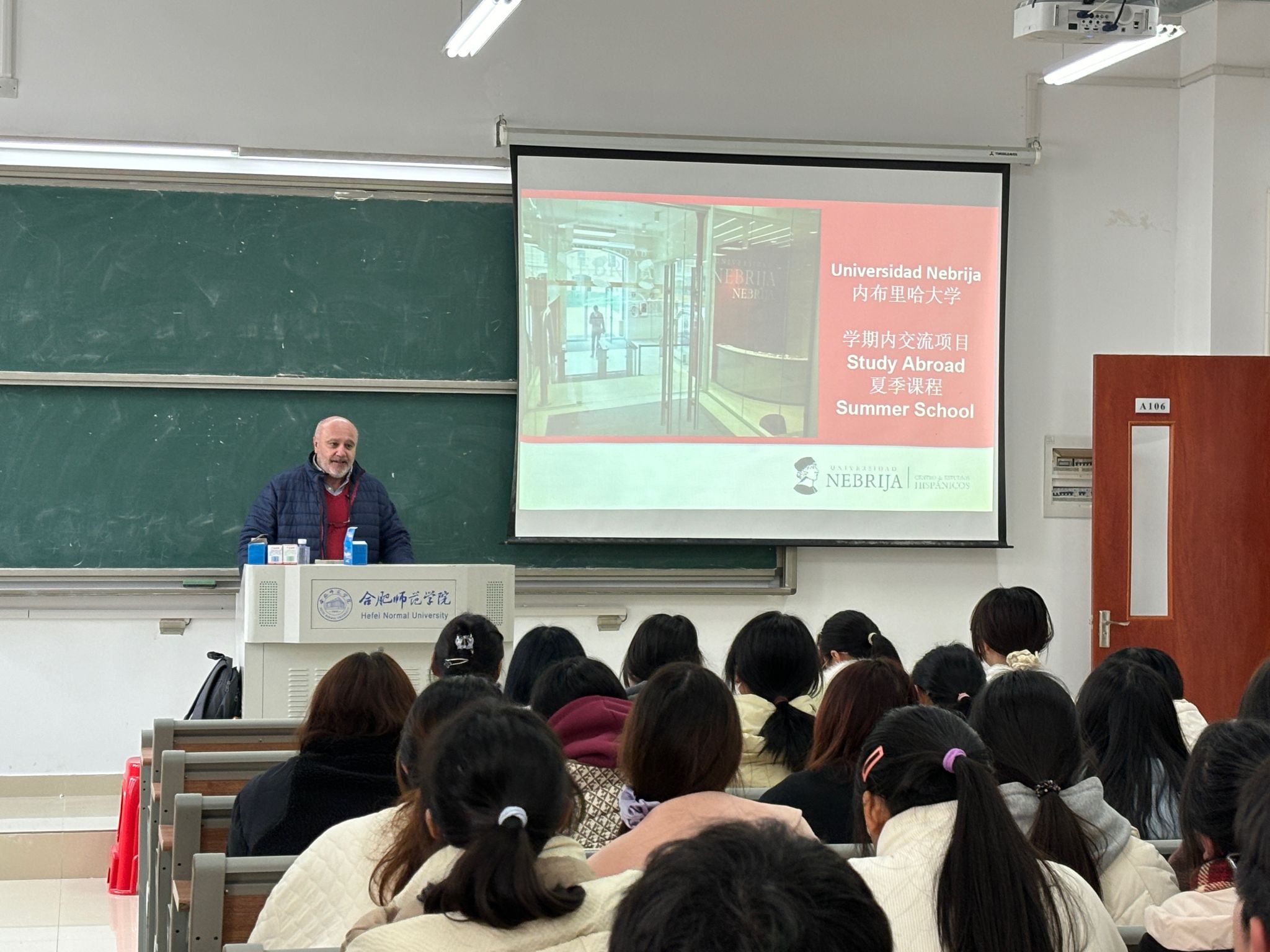 蒋道华首先转达了beat365唯一官方网站院领导对来访嘉宾的热烈欢迎,并对深化两校合作提出了一些建议。其次,来访代表Lluvia Xu着重介绍了内布里哈大学的西班牙语专业建设优势、我院学生目前在内布里哈大学的学习生活情况和进一步推进两校多层次合作的愿望,特别是对beat365两位同学赴布里哈大学学习优异表现给予了高度的评价,希望今后更多的beat365唯一官方网站学子能赴内布里哈大学学习交流。之后,吴礼敬详细介绍了外国语学院西班牙语专业的办学情况、特色建设和课程设置,希望通过此次交流能够进一步深化两校之间已建立的合作关系。张照介绍了西班牙语专业学生培养方面的具体情况,同时,希望两校能够深化西班牙语学科领域的学术合作、专业建设、教师研修和科研合作平台建设。其他参与见面会的西班牙语专业教师也从各方面谈了自己的看法,特别是在教师专业发展、数字资源共享、优势学科合作、科研共享平台搭建等多个领域的合作可能性进行了深入的沟通。最后,Javier Diaz为滨湖校区西班牙语专业学生做了一场宣讲会。