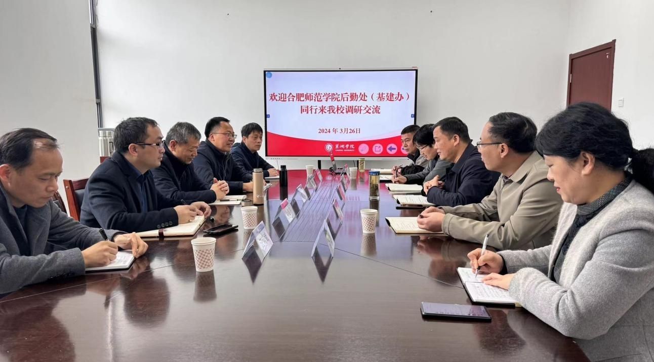 为进一步借鉴学习省内兄弟院校先进的管理模式,更好地将“服务育人”理念融入到后勤管理全过程,3月26日,后勤处(基建办)一行5人赴巢湖学院调研后勤服务保障与管理工作经验。巢湖学院后勤处处长汪泰,副处长吴仁斌、李季纲,以及相关科室负责人参与了此次交流。