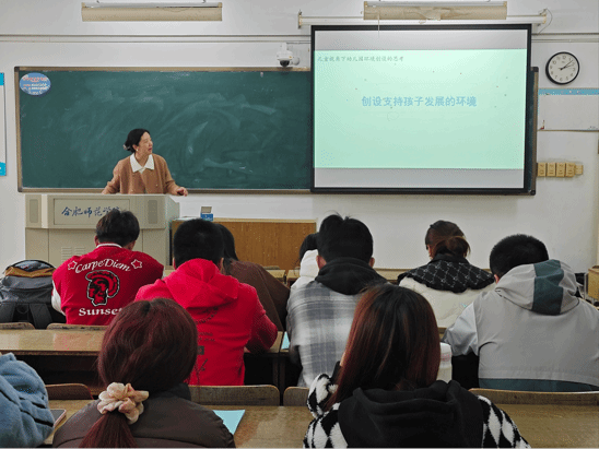 3月25日下午,合肥市望联路幼儿园园长杨慧在锦绣校区博约楼316教室开展“创设支持孩子发展的环境”主题讲座。杨慧指出,幼儿园工作中存在幼儿参与创设程度低、对环节知晓度不高以及主题课程环境少等实际问题,环境创设要坚持遵循一致性、适宜性、经济性和幼儿参与性等原则,创设满足幼儿学习、生活和游戏的需求,帮助幼儿树立信心,满足幼儿归属感。本次讲座,杨慧为学生指明了环境创设的方向,为实习工作打下坚实基础。