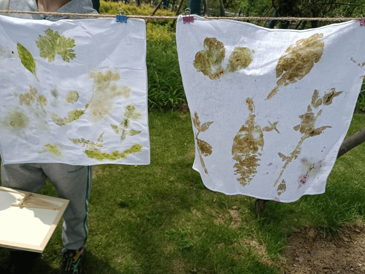 知识普及环节结束后,志愿者们带领全体小学员寻找落叶和花朵并进行拓染,小学员们将这些植物的颜色拓染在白布上,然后晾晒、裱框,将一副春日风景图带回家,同时也为此次的活动画上一个圆满的句号。
