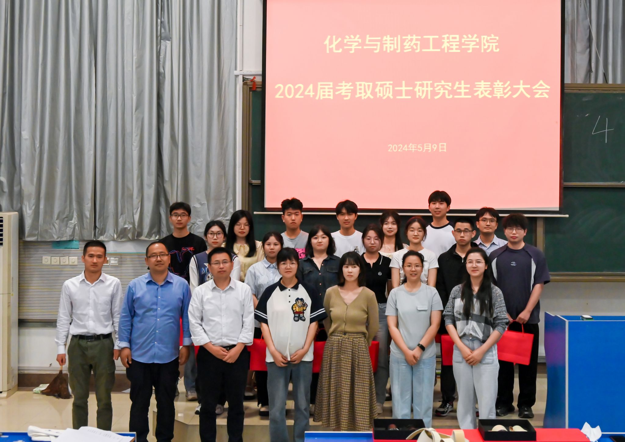 为表彰考研成功优秀学子,激励我院广大学子考研热情,弘扬优良的院风学风,5月9日,化学与制药工程学院于逸夫楼西阶3教室举办2024届毕业生考取研究生表彰大会,会议由毕业班辅导员汪颖主持,各班辅导员、学业导师,2024届毕业生考取研究生学生以及学院各年级在校生参加会议。