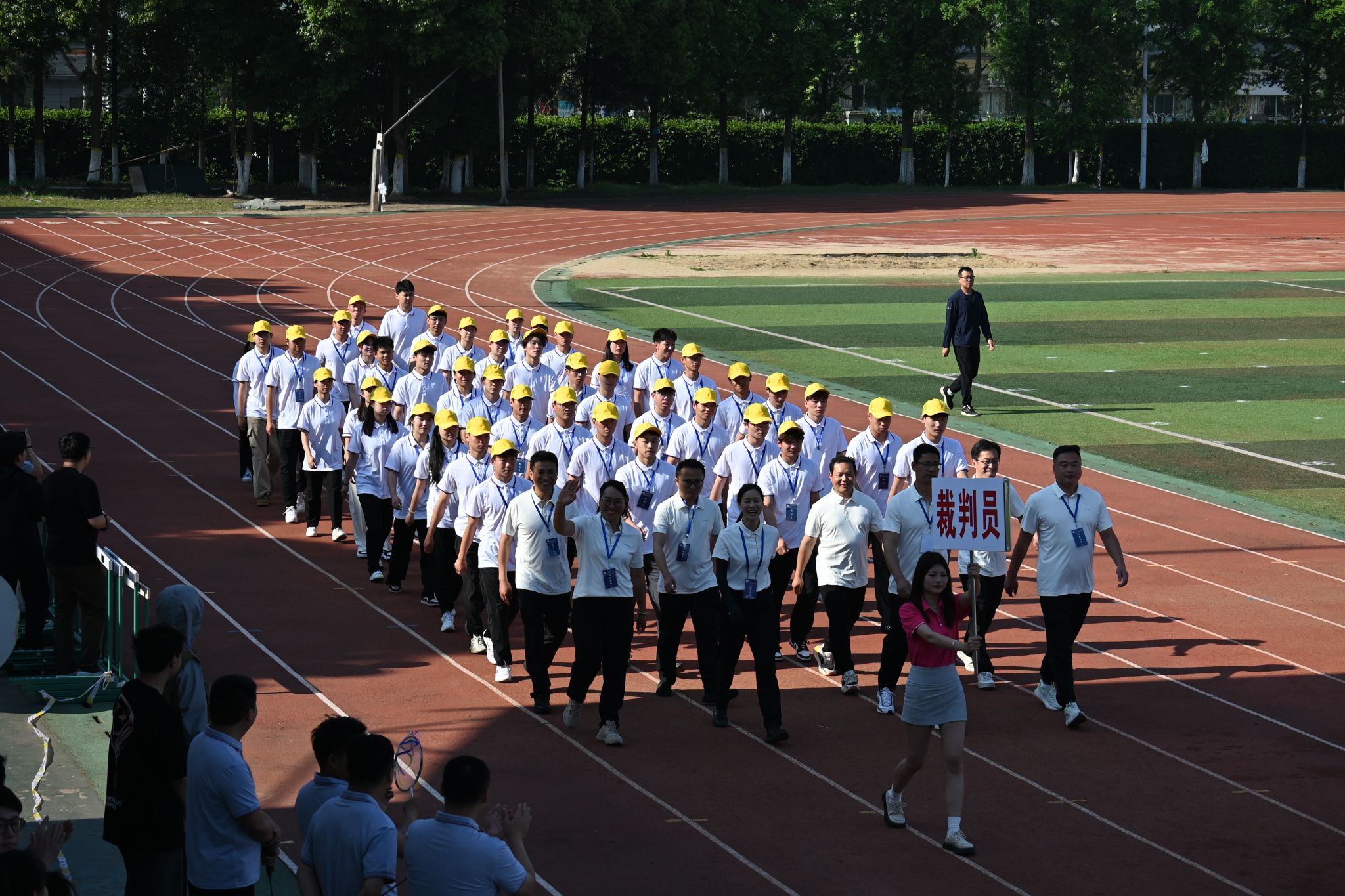 风吹日晒不畏辛苦;裁判员们以实事求是的工作态度,热情、饱满的工作精神,认真履行裁判员职责,秉公执裁,积极参与校运动会,以实际行动确保校运会的安全有序进行。感谢每一位裁判员志愿者的辛勤付出。(体育科学学院:钱昶臻 苏龙)