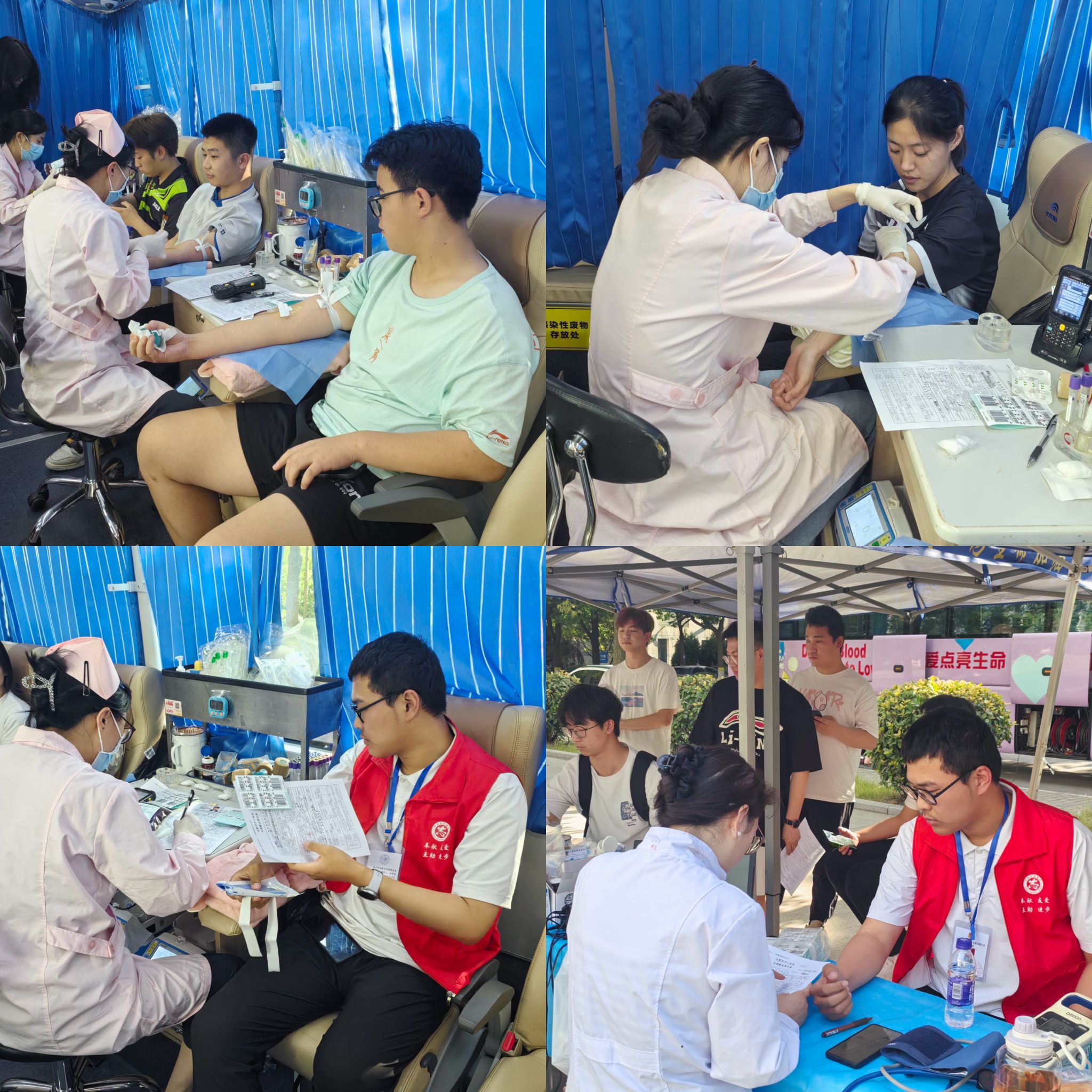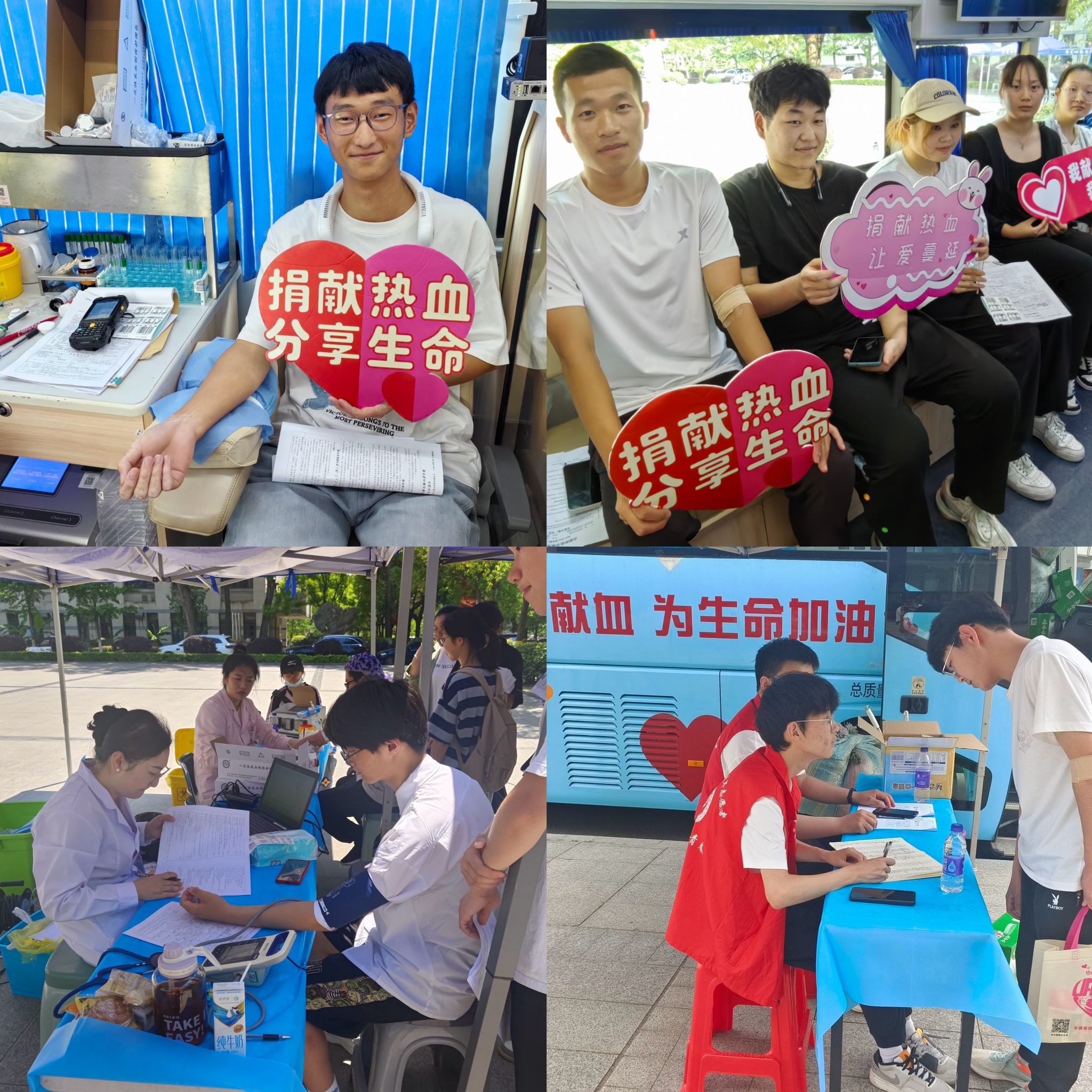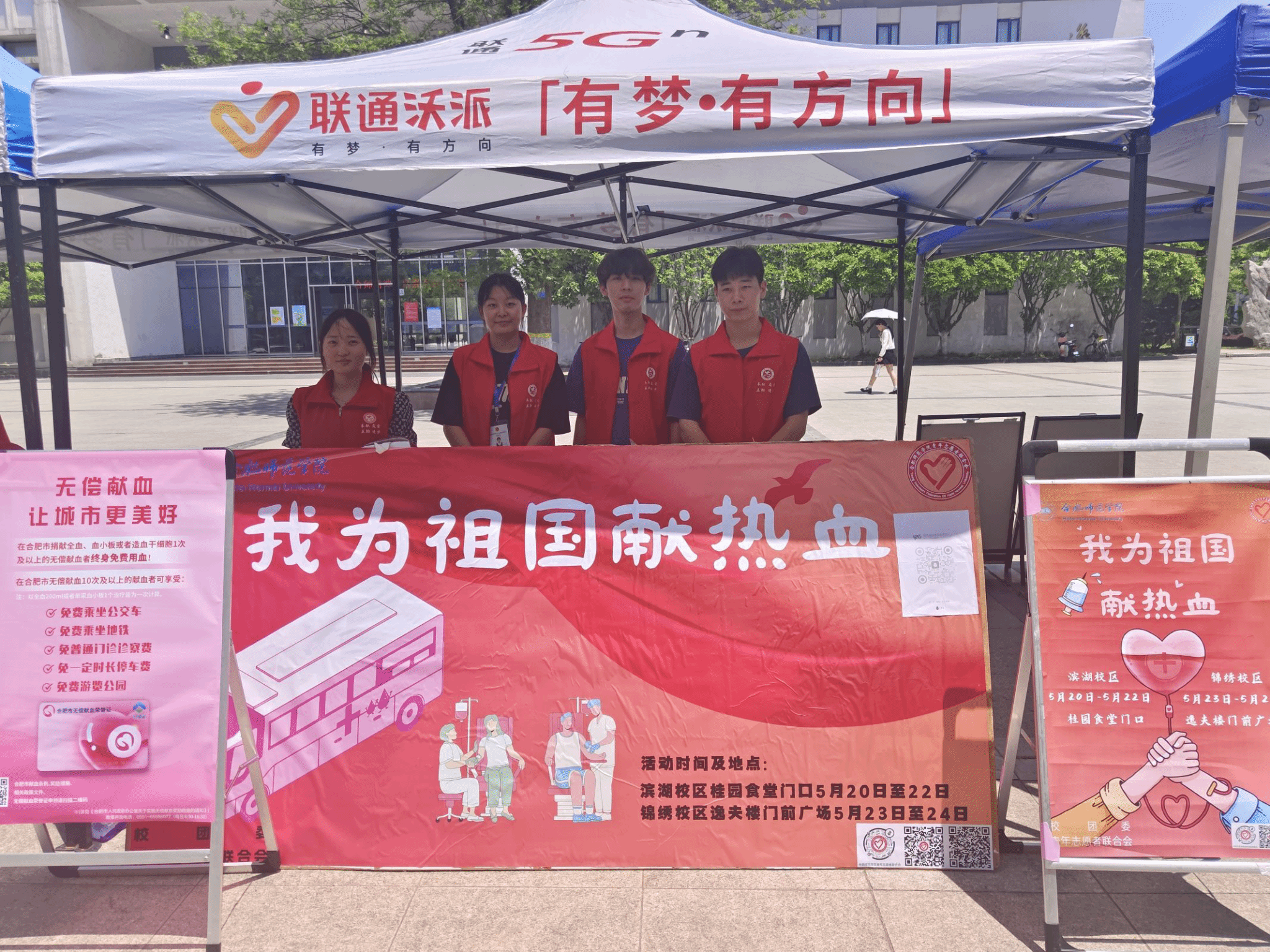 5月20日至24日,我院青年志愿者联合会(以下简称“青志联”)联合安徽省血液中心、合肥市中心血站分别于锦绣校区逸夫楼前广场与滨湖校区桂园餐厅旁开展了“我为祖国献热血”无偿爱心献血志愿活动,旨在唤起青年学子对无偿献血的关注和认识,传递社会正能量。