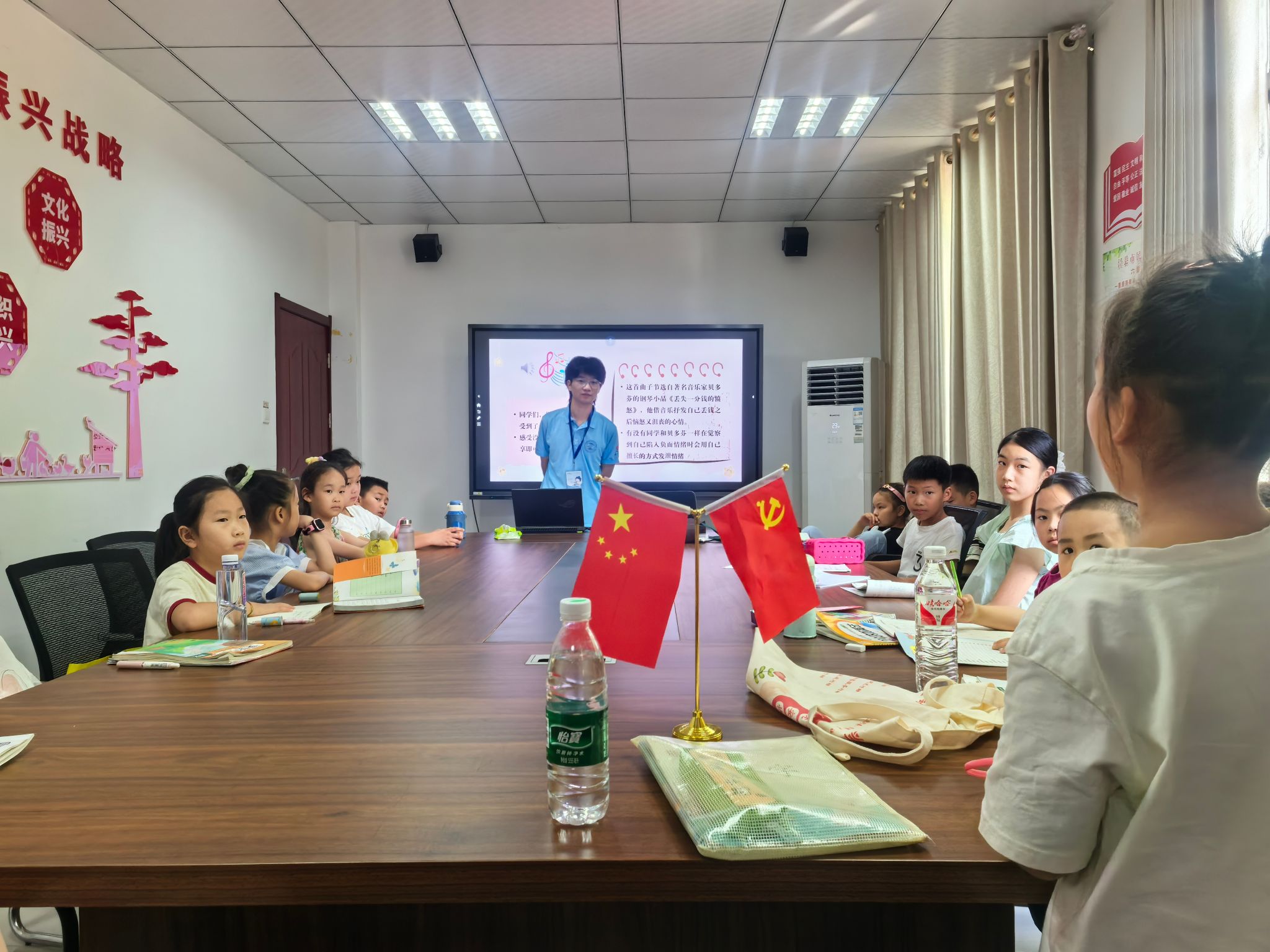 7月18日上午,院团委泾县昌桥乡行知学堂的“小先生”们为缓解小学员们成长过程中遇到的各种压力和挫折,同时也为了让小学员感受换位思考和理解彼此情绪的重要性,体悟对彼此的理解是化解负面情绪的良药这一道理。“小先生”刘乙磊以拥抱“暴暴”为主题,通过课件、音频、颜料、“暴暴”的故事、“暴暴”毛绒玩偶、爱心便利贴等载体,开展了本次心理健康教育课。