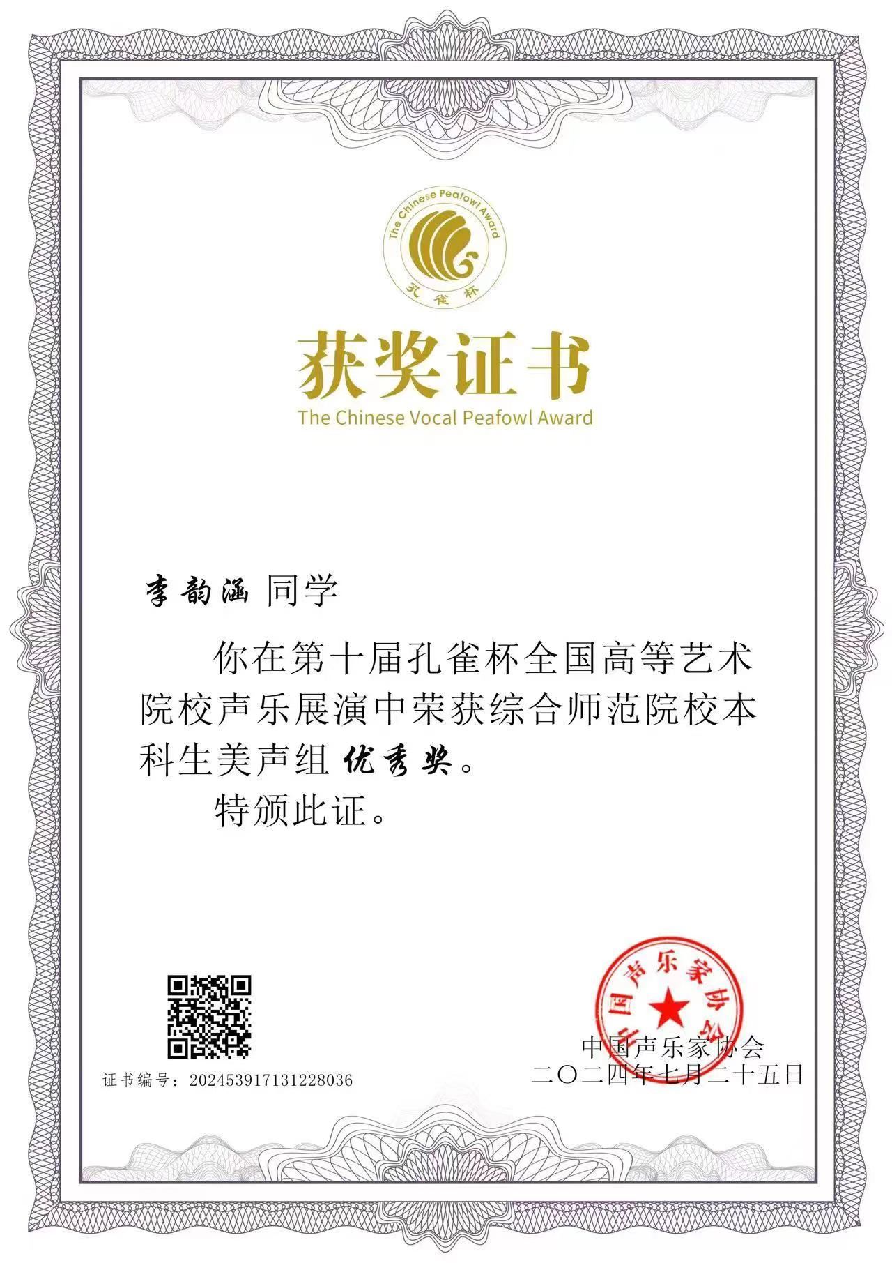 孔雀奖声乐比赛作为我国声乐领域的重要赛事,旨在挖掘和培养新一代声乐人才,推动我国声乐艺术的繁荣发展,是全国高校唯一常设的声乐综合性大奖,也是中国声乐权威赛事之一,具有重大的学术影响力和专业认可度。孔雀奖的荣誉,不仅是对李韵涵同学声乐才华的认可,更是音乐学院教学成果的一次集中展现。此次大赛的参与,检验了音乐学院声乐方向学生的培养质量,进一步坚定了音乐学院的人才培养目标:“立足合肥、面向安徽、辐射长三角”,培养具有创新精神的优秀人才。(音乐学院:谢梦珂)