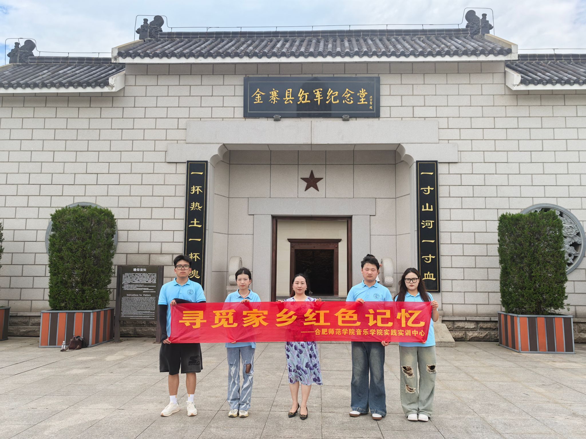 为认真贯彻落实习近平总书记关于乡村文化振兴工作的重要指示精神,充分发挥实践育人优势,持续深化“暑期实践”活动建设,音乐学院开展了“寻觅家乡红色记忆”暑期“三下乡”活动。8月1日,院实践实训中心主任陆伟副教授带领学生前往金寨,开展一场“弘扬爱国主义传承红色基因”的实践之旅。学院师生一行人抵达红军广场,来到金寨革命烈士陵园。全体成员满怀深深的崇敬与敬仰之情,在庄严肃穆的国歌声中,向英雄烈士献上花篮,表达对革命先辈的无限敬意与哀思。