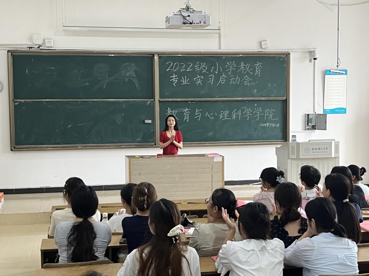 本次实习启动会的顺利召开,不仅为2022级小学教育专业学生的实习工作指明了方向,也为学院实践育人工作的发展注入了新的动力。相信在学院领导、老师和学生的共同努力下,本次实习工作将会取得圆满成功,为培养更多优秀的小学教育人才做出积极贡献。(教育与心理科学学院:唐银 朱一卓)