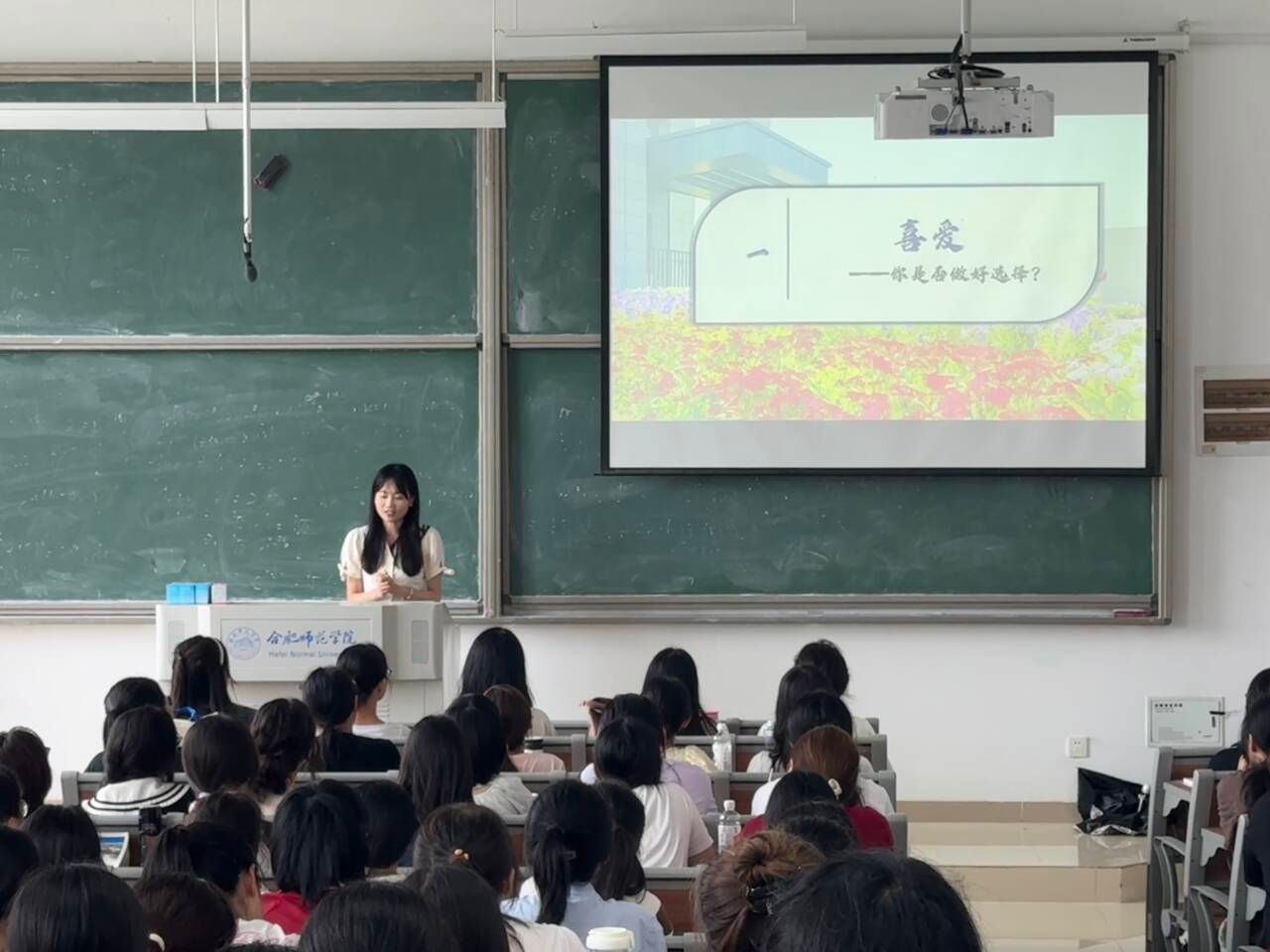 合肥市第一中学“道德与法治”课教师周子寒以《青年教师角度谈师范生成长》为题,和新生分享了自己在求学工作过程中的成长经历,从“喜爱——你是否做好选择”“逐爱——你是否准备充足”“热爱——前路漫漫亦灿灿”三个角度分享了自己宝贵的成长经验。通过自己如何从一个内向不敢上台的学生蜕变成勇于在讲台展现自己的教师的经历,引导新生要加强锻炼自己,勇于上台展示自己。通过自身准备考编的故事,强调万事要提前做好准备,厚积薄发,机会都是留给有准备的人。